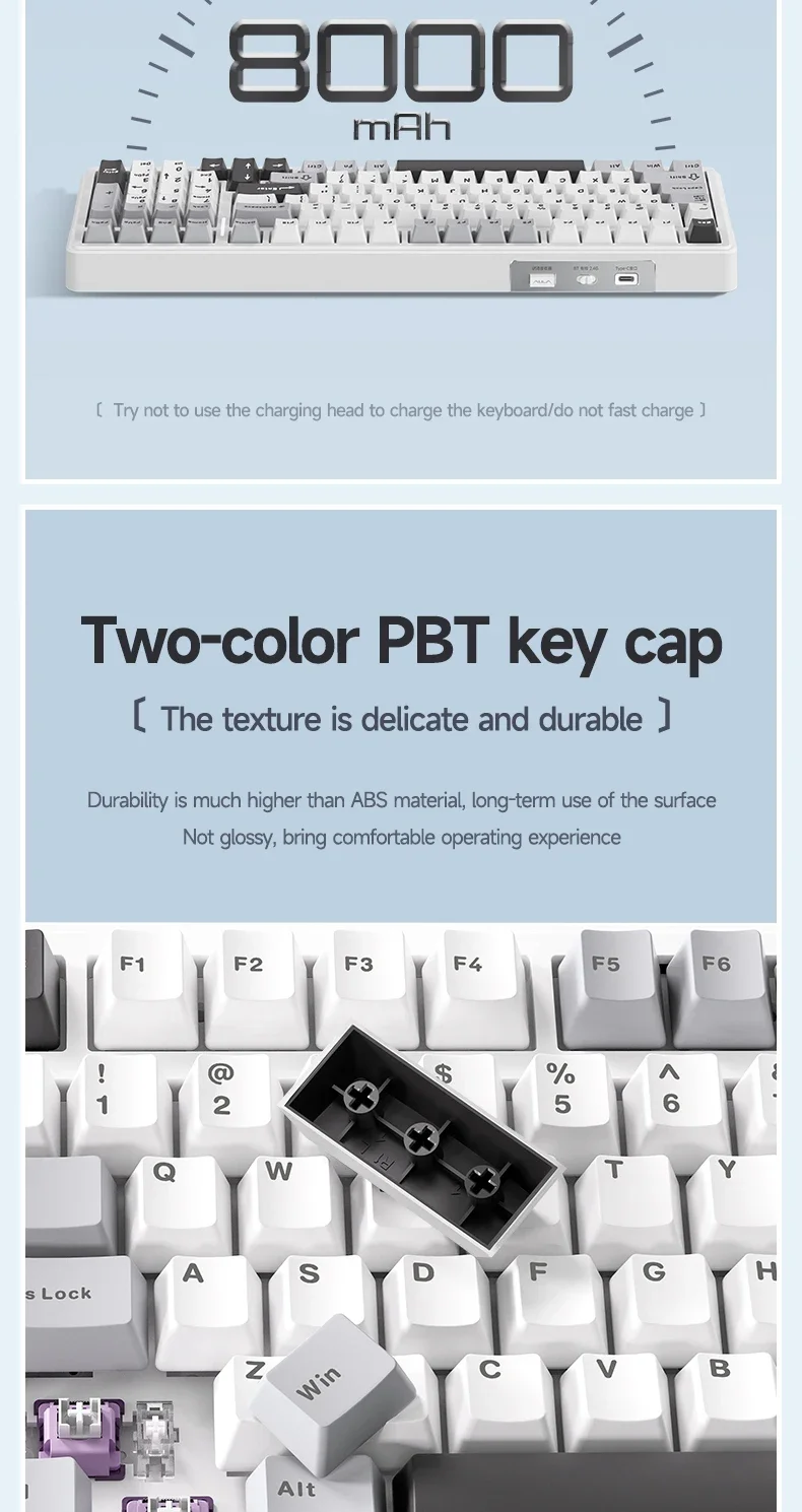 Las teclas PBT tienen una durabilidad mucho mayor que el material ABS, y la superficie no será brillante después de un uso a largo plazo, lo que brinda una experiencia de funcionamiento cómoda.