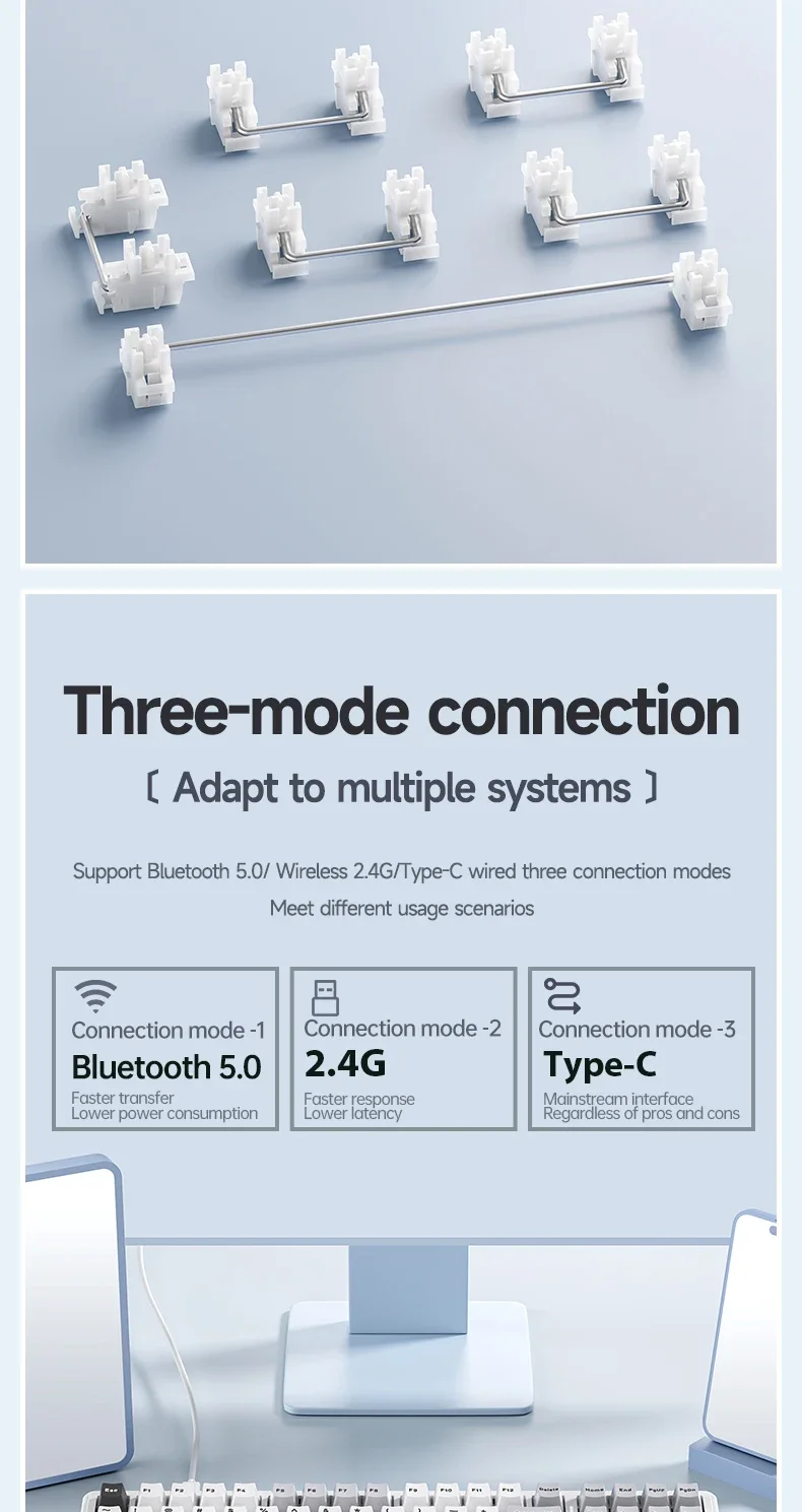 La ranura de almacenamiento del receptor y la conmutación de tres modos se encuentran sobre el teclado. El cambio lateral no requiere volteo, lo cual es simple y elegante.