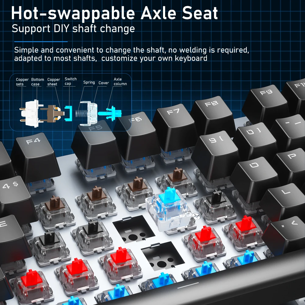 El Teclado mecánico F2088 es un teclado intercambiable en caliente (eje cian predeterminado), las 108 teclas se pueden reemplazar con teclas, ejes de teclas. Como teclado para juegos para el uso de la multitud, puede cambiar el eje de las teclas que desea producir diferentes efectos y sonidos de teclas. La carcasa base está hecha de aleación de aluminio, que es muy duradera y no produce ruido cuando se presiona.