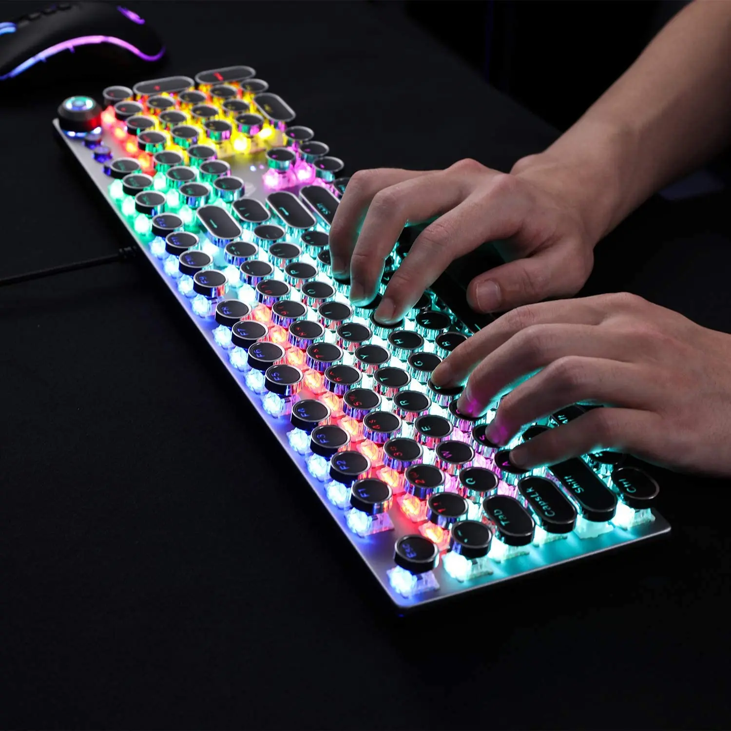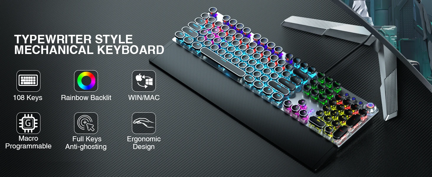 El interruptor mecánico ofrece una respuesta más rápida y elástica, sonido de clic nítido, retroalimentación táctil precisa para el máximo rendimiento del juego. Teclas redondas vintage Steampunk moldeadas por inyección de doble disparo para una retroiluminación clara y una durabilidad extrema. La tecla flotante escalonada se adapta perfectamente a las yemas de los dedos para un posicionamiento preciso, evita la fatiga y escribe incorrectamente.