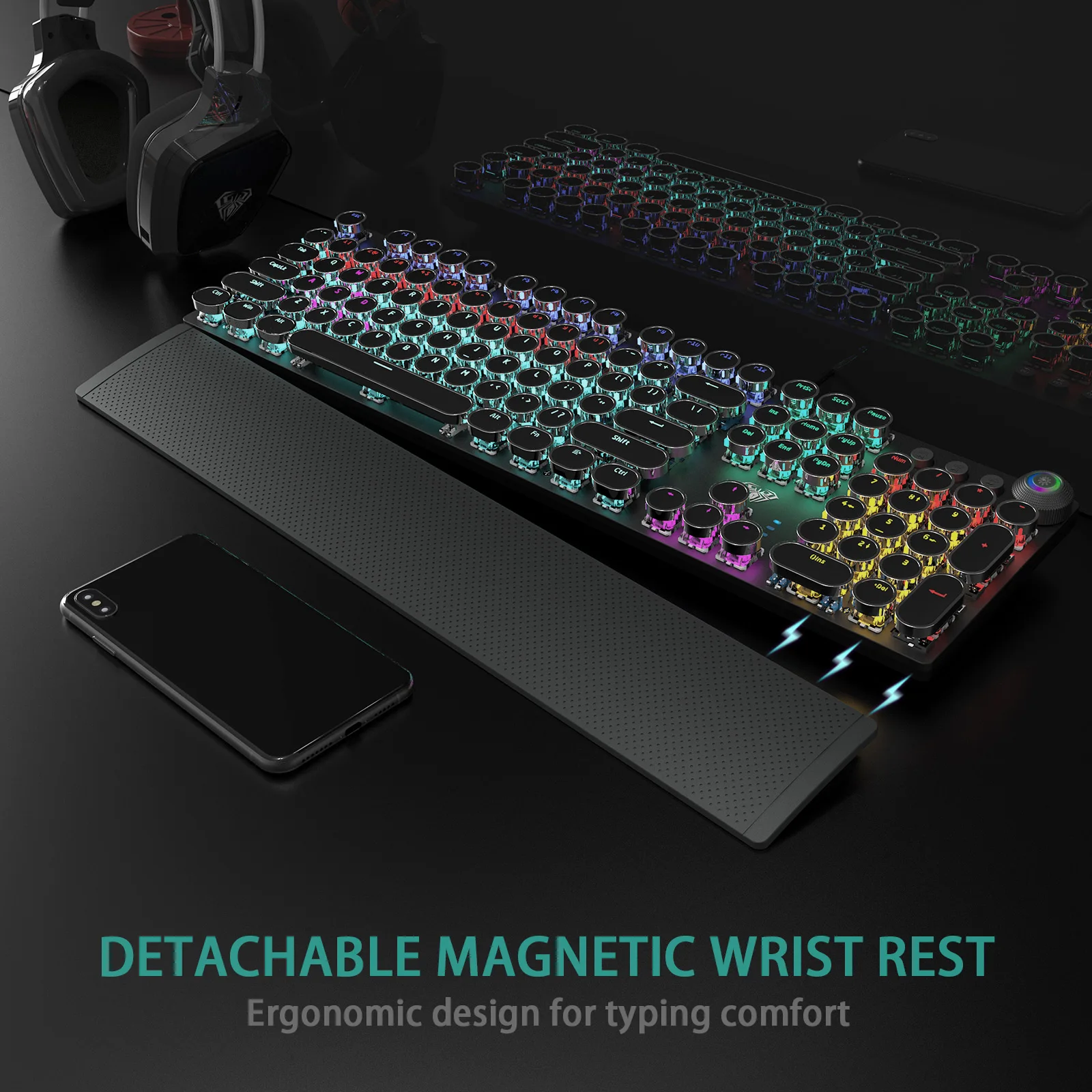 Teclado mecánico estilo máquina de escribir AULA F2088, con retroiluminación LED arcoíris, interruptores marrones táctiles, reposamuñecas extraíble, perilla de control multimedia, teclas redondas retro, teclado de juego de PC con cable USB de tamaño completo