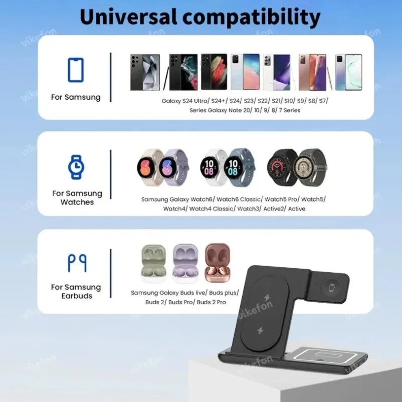Acerca de este artículo 【Estación de carga inalámbrica para múltiples dispositivos】 El cargador inalámbrico 3 en 1 está especialmente diseñado para cargar dispositivos Samsung.Para la versión Samsung: adecuado para teléfonos móviles Samsung Galaxy Z Fold 5/4/3/, Z Flip 5/4/3; W23/W22/W21; Galaxy S23 S22 S21 S20/Ultra/Plus/FE; S10/S10e/S10+/S9/S9+; Nota20/ 10/9/8; Galaxy Watch 6/6Classic/5 Pro/5/4 Classic/3/Active2/1.; Galaxy Buds/Pro/Buds+/Buds2/Live.(NOTA: NO PARA APPLE WATCH u relojes de otra marca)