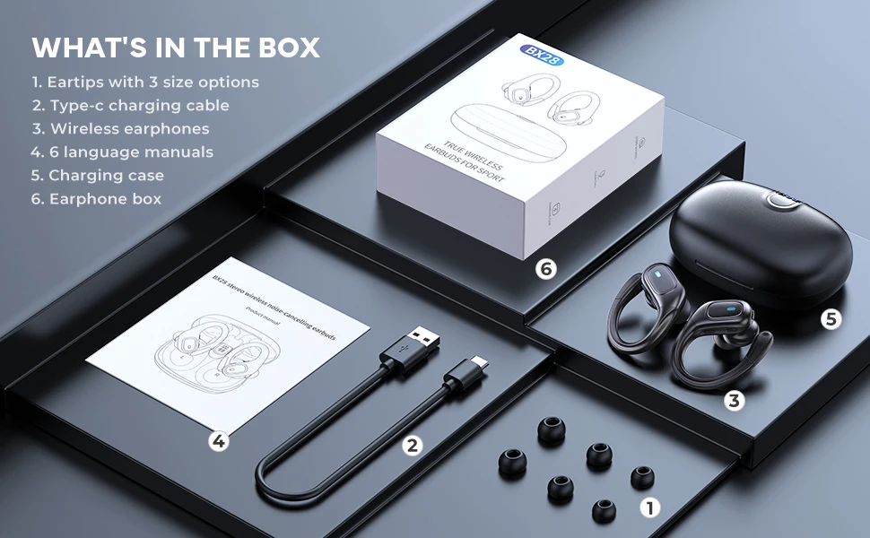 【Especificaciones de embalaje y posventa】:BX28 incluye un estuche de recarga, auriculares inalámbricos, cable de carga tipo C, tapones para los oídos/arfina × 3 pares (instalación inicial M) y manual de instrucciones.