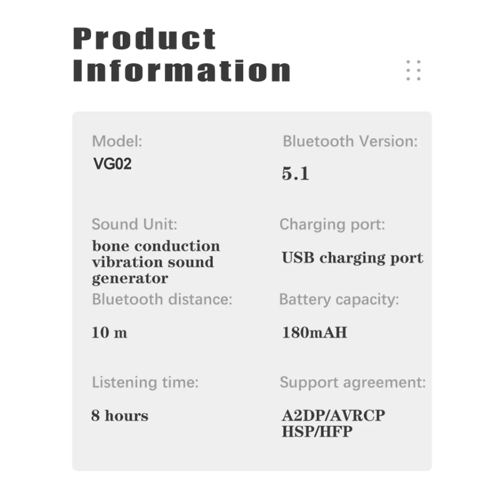 Descripción: Los auriculares inalámbricos abiertos rodean el campo de sonido direccional, diseño abierto, a prueba de sudor e impermeable, pequeños Úselo cómodamente sin clips para las orejas, proteja las orejas de daños Campo de sonido direccional circundante El altavoz Adopta tecnología de diafragma físico Duración de la batería de 180mAh, Chip Bluetooth 5,1, menor consumo de energía, mayor duración de la batería, resistente al agua IPX5 Adopta un exquisito diseño de cabina de recolección de energía y una batería incorporada de gran capacidad para sus auriculares. Especificación: Modelo: VG02 Chip: 5325B Versión Bluetooth: 5,1 Altavoz: φ 16mm/NORMAL Distancia de transmisión: 10m Capacidad de los auriculares: 180Mah Tiempo de conversación: 8 horas Tiempo de reproducción: 10 horas Tiempo de carga: 3H El paquete incluye 1 unidad auriculares inalámbricos 1 cable de datos 1 pieza manual