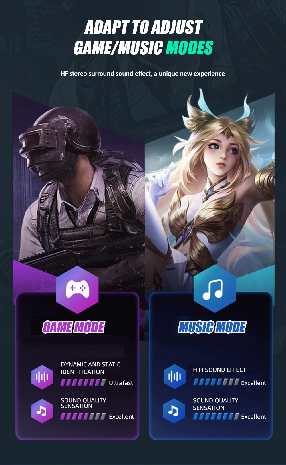 1. Selección de audio dual de equipo profesional, equipado con interfaces de 3,5mm y tipo C mm, para que la competencia electrónica pueda jugar juegos sin restricciones.