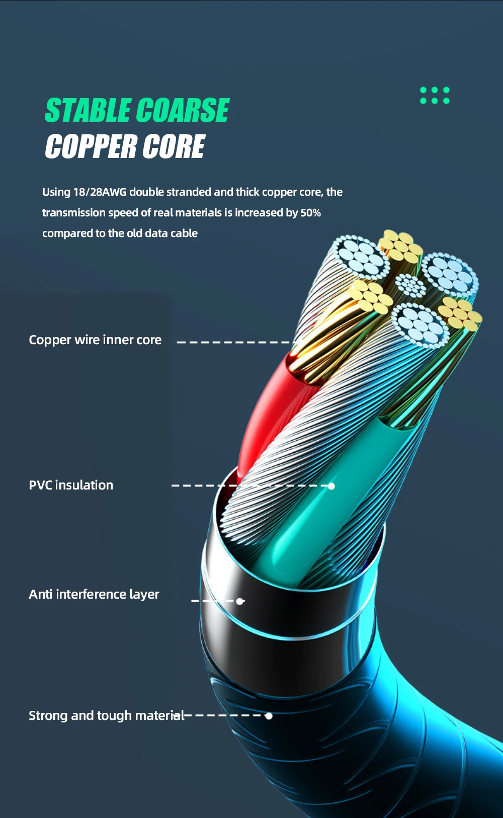 5. Usando un núcleo de cobre engrosado de doble hebra de 18/28AWG, la velocidad de transmisión de los materiales reales aumenta un 50% en comparación con la antigua línea de datos