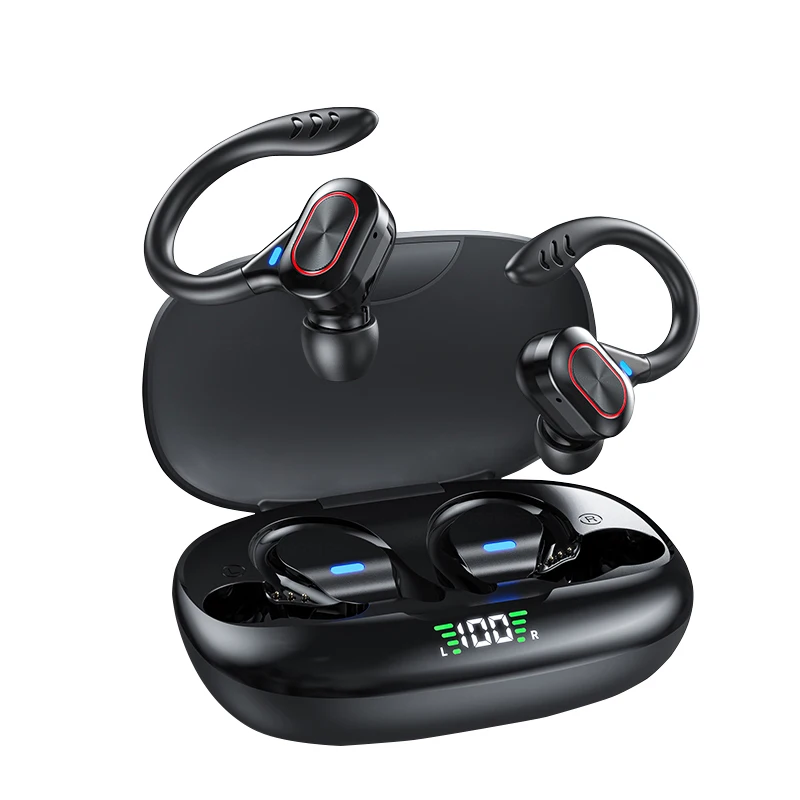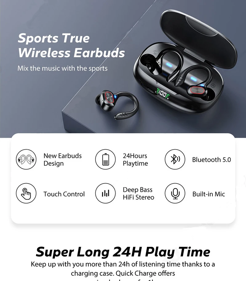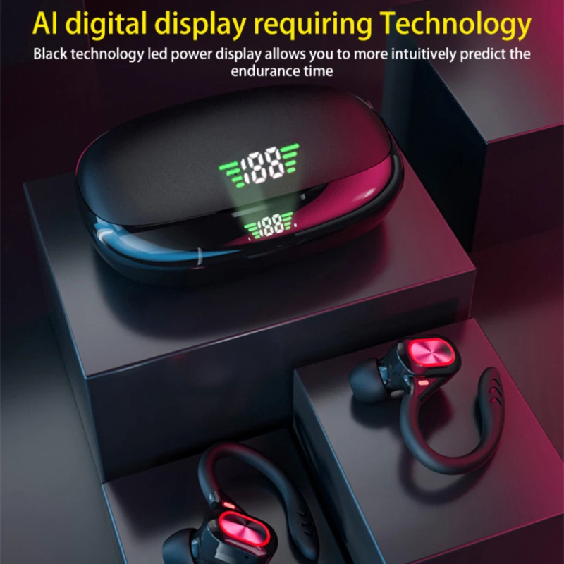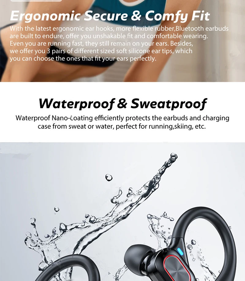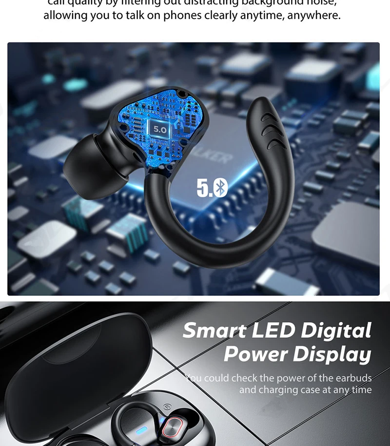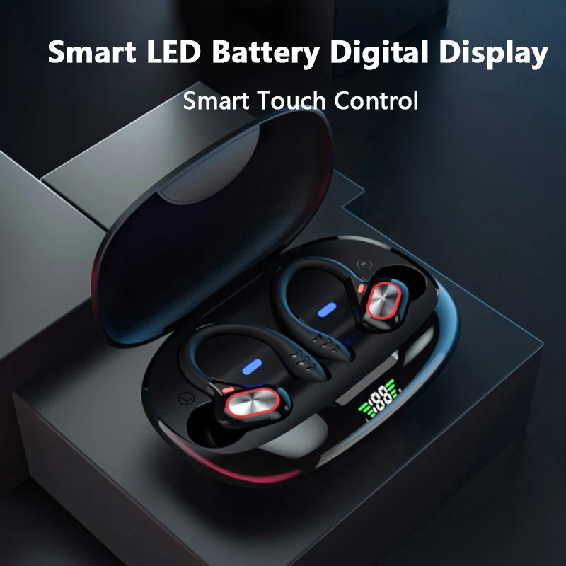 Comprar Auriculares deportivos inalámbricos con Bluetooth y micrófono, audífonos impermeables con ganchos para las orejas y Control táctil, auriculares de música estéreo HiFi con pantalla LED