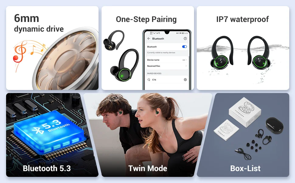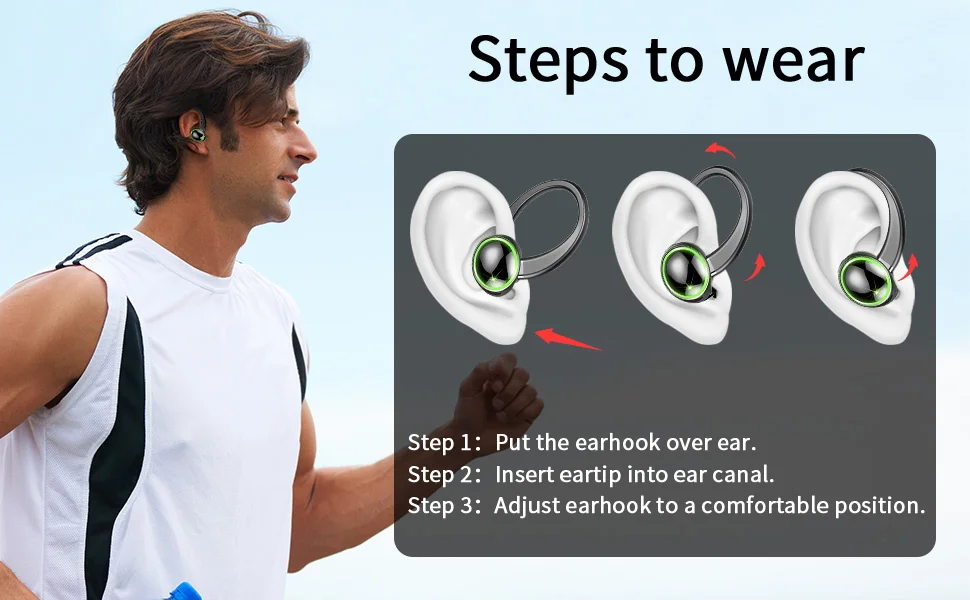 【Gancho para la oreja para deportes e impermeable IP7 】: Los ganchos de silicona ajustables y de ajuste seguro y el diseño ergonómico aseguran que los auriculares deportivos se mantengan cómodos en su lugar al hacer deportes, correr, otras actividades al aire libre, etc. (Nota: no es compatible con su uso al nadar.)