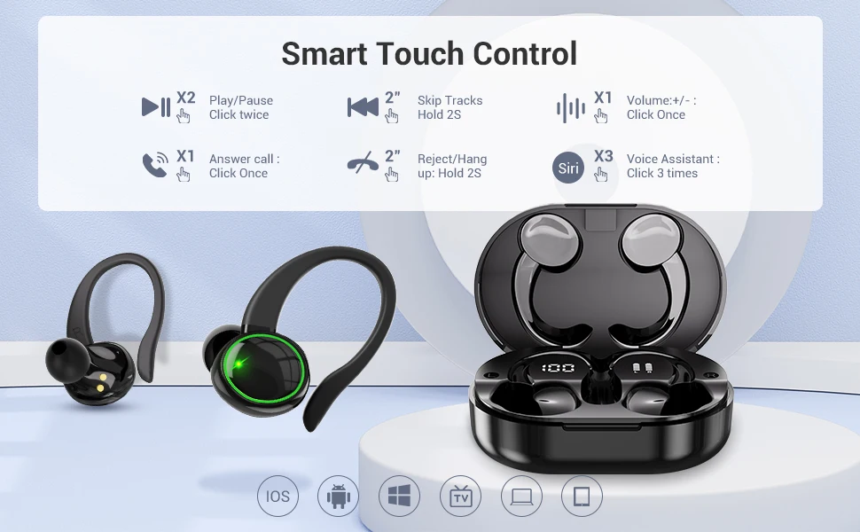 【Smart touch control】: Headphones wireless bluetooth can connect automatically to the Bluetooth of your mobile phone when you open the charging box,