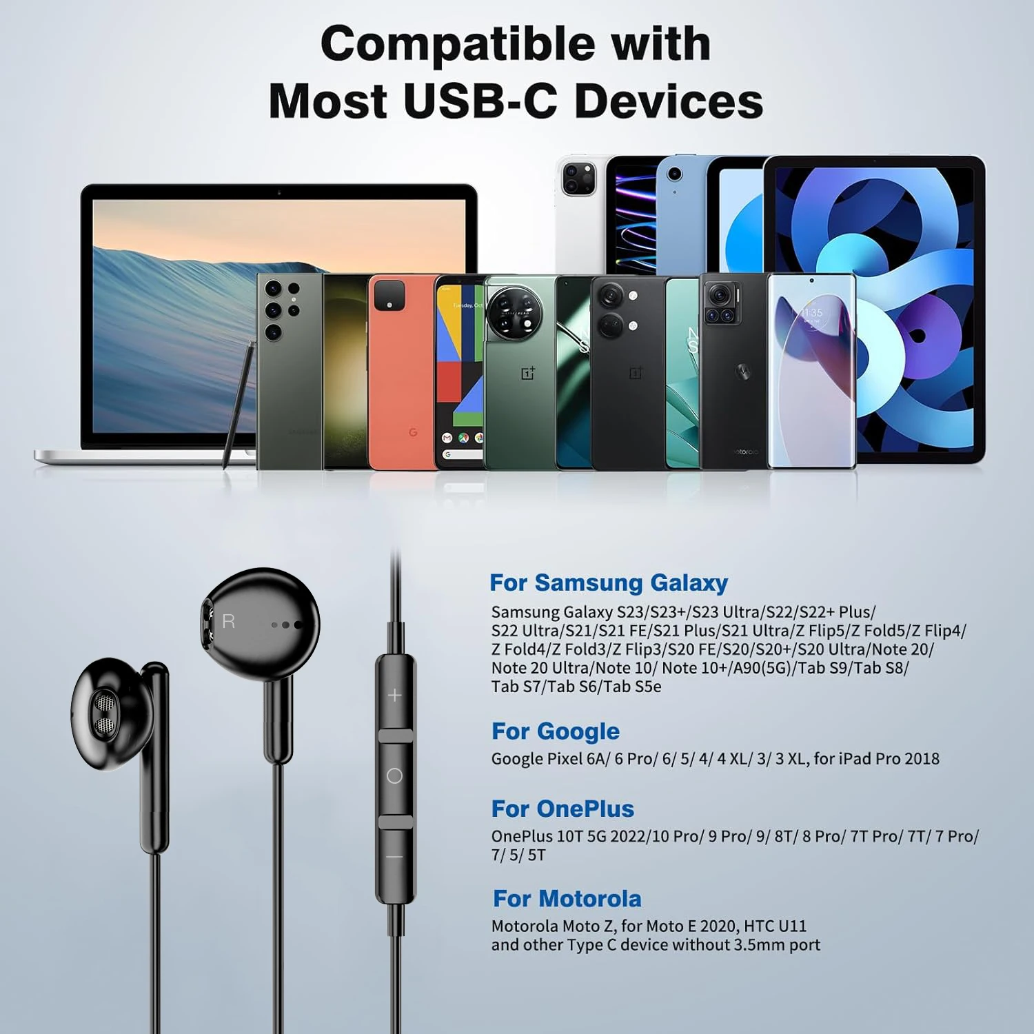 【COMPATIBILIDAD VERSÁTIL】: auriculares USB C para iPhone 15 Pro Max, Samsung Galaxy S23 Ultra/S23/S22/S21 Ultra/S21/S21 FE/S20 FE/S20 Ultra, galaxy A54 5G/A34 5G/A53 5G/A33 5G, Galaxy Z Flip 4/ Z Fold4, Google Pixel 7 Pro/7a/6a/6 Pro/6/5 XL, para iPad Pro 2022/ 2021/2020/ iPad 10th Gen/ iPad Air 5/4/ Mini 6, OnePlus 11 Pro/10 Pro/10T/9 Pro.