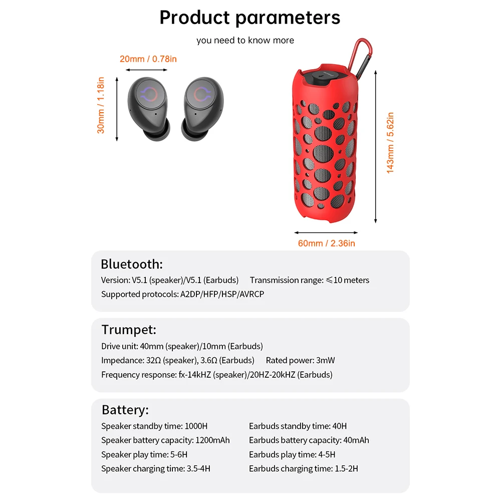 9. El auricular tiene una capacidad de batería de 40 mAh, un tiempo de reproducción único de 4-5 horas (el contenedor de carga se puede recargar 10 veces), y el altavoz tiene una duración única de 5-6 horas.