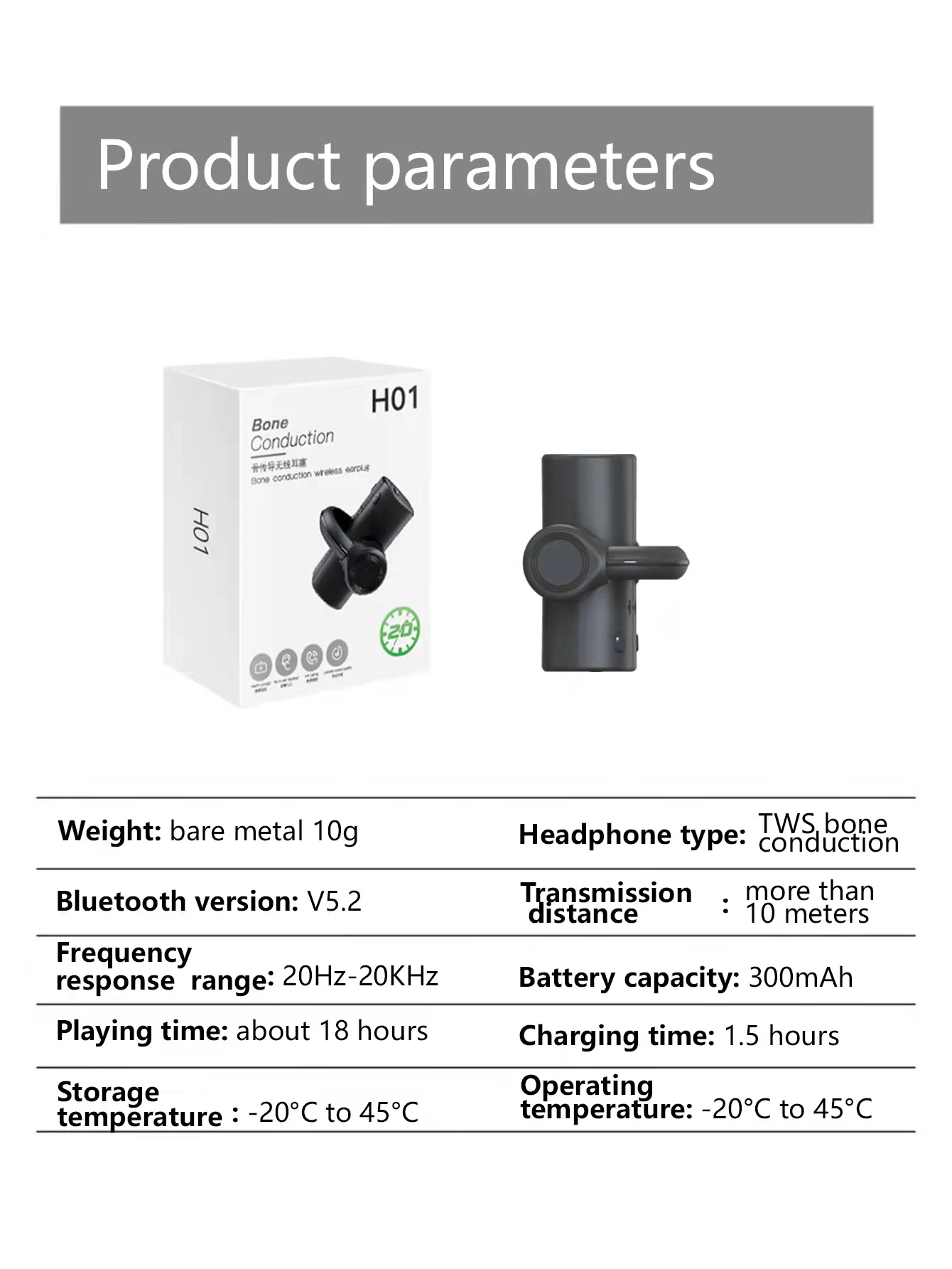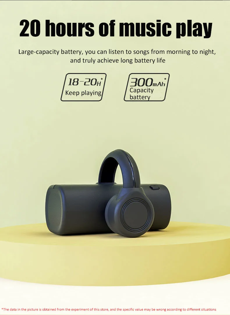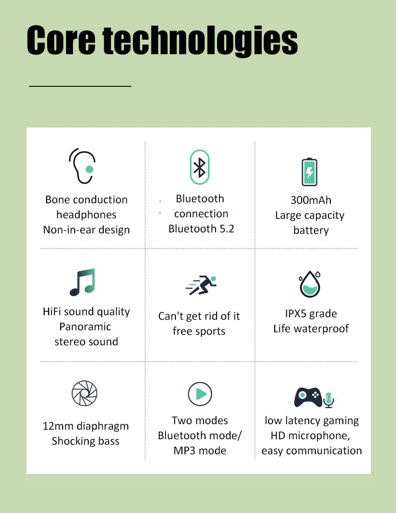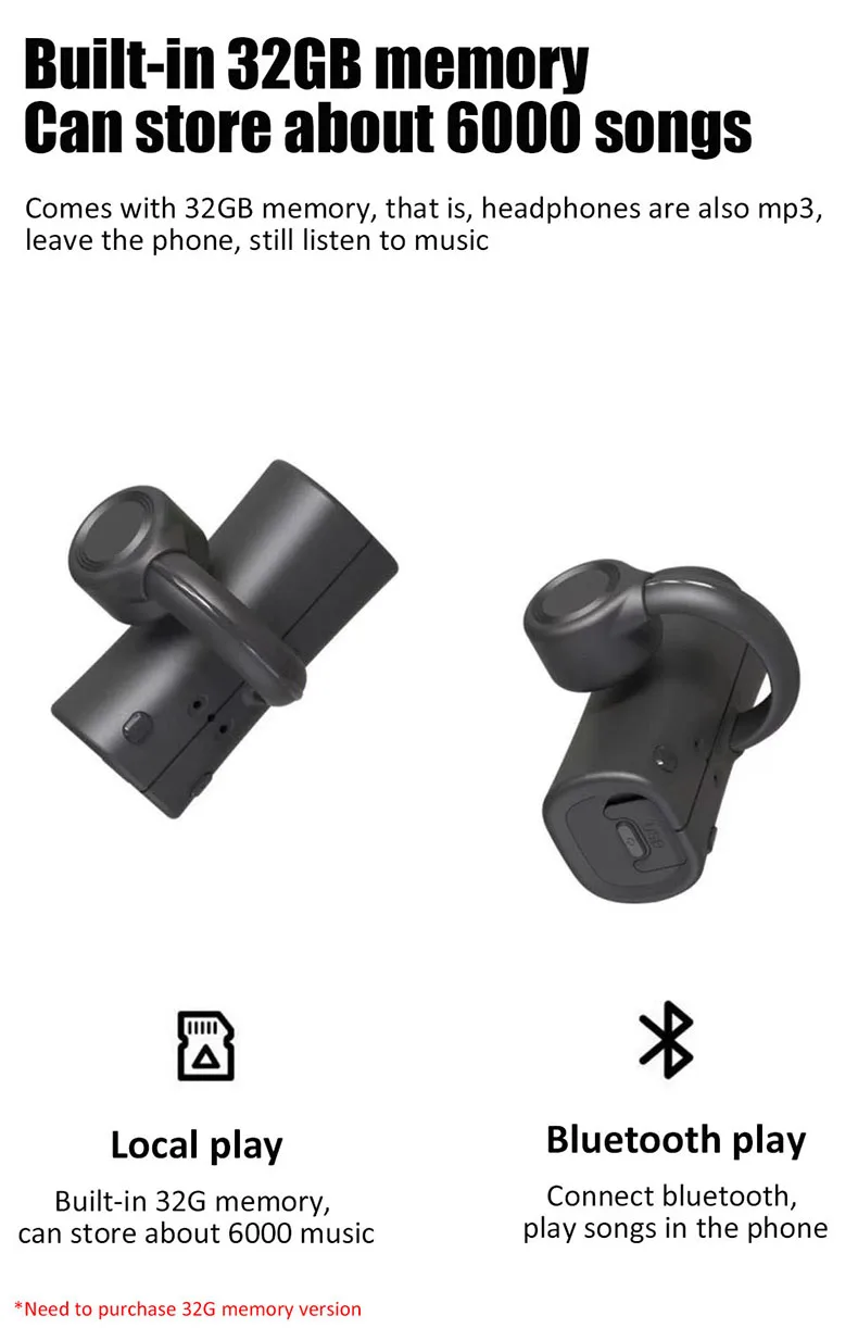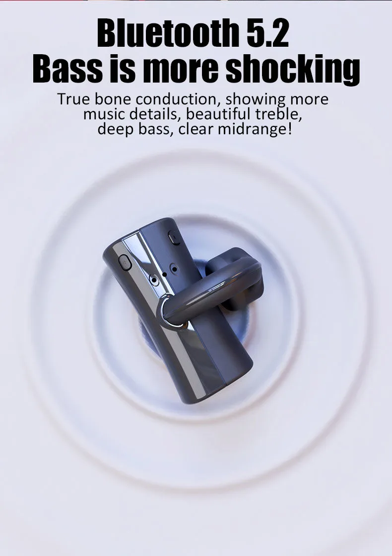 32G Wireless Bone Conduction Earphones Bluetooth 5.2 Headphone Not In-Ear IPX5 Waterproof Sports Earbuds Handsfree HiFi HeadsetProduct parameters:Weight: about 10gHeadphone type: TWS bone conductionBluetooth version: V5.2Transmission distance: more than 10 metersFrequency Response Range: 20Hz _20KHzBattery capacity: 300mAhPlaying time: about 18 hoursCharging time: 1.5 hoursStorage temperature: -20°C to 45°COperating temperature: -20°C to 45°C