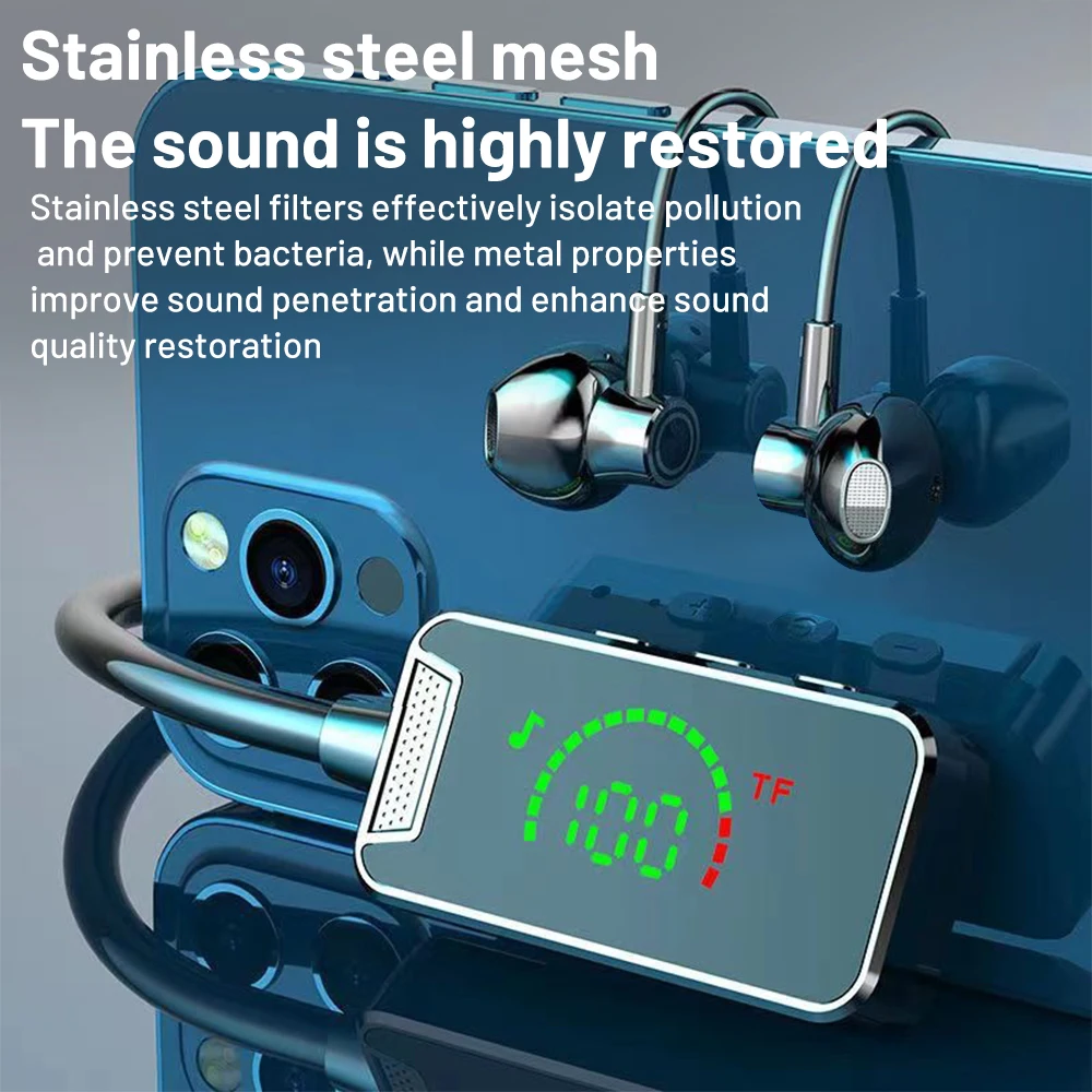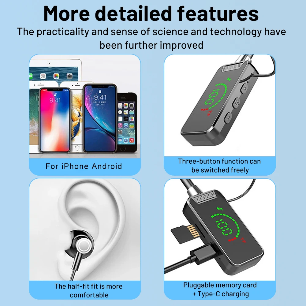 6.Reproducción de tarjeta TF Diseño de auricular Bluetooth, que almacena música favorita en la tarjeta, lo que le permite escuchar música sin usar su teléfono.