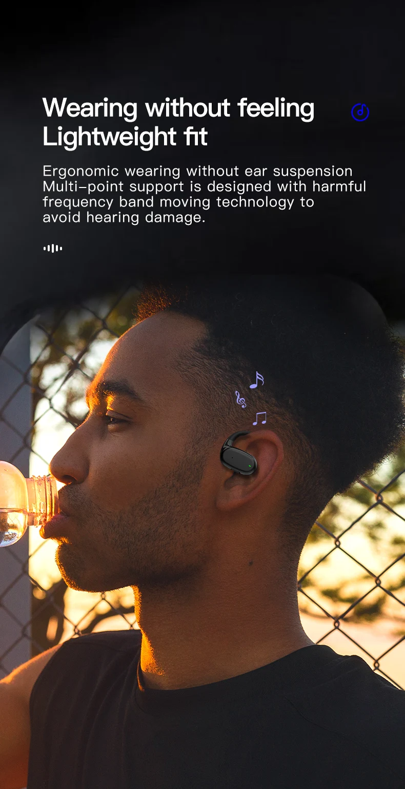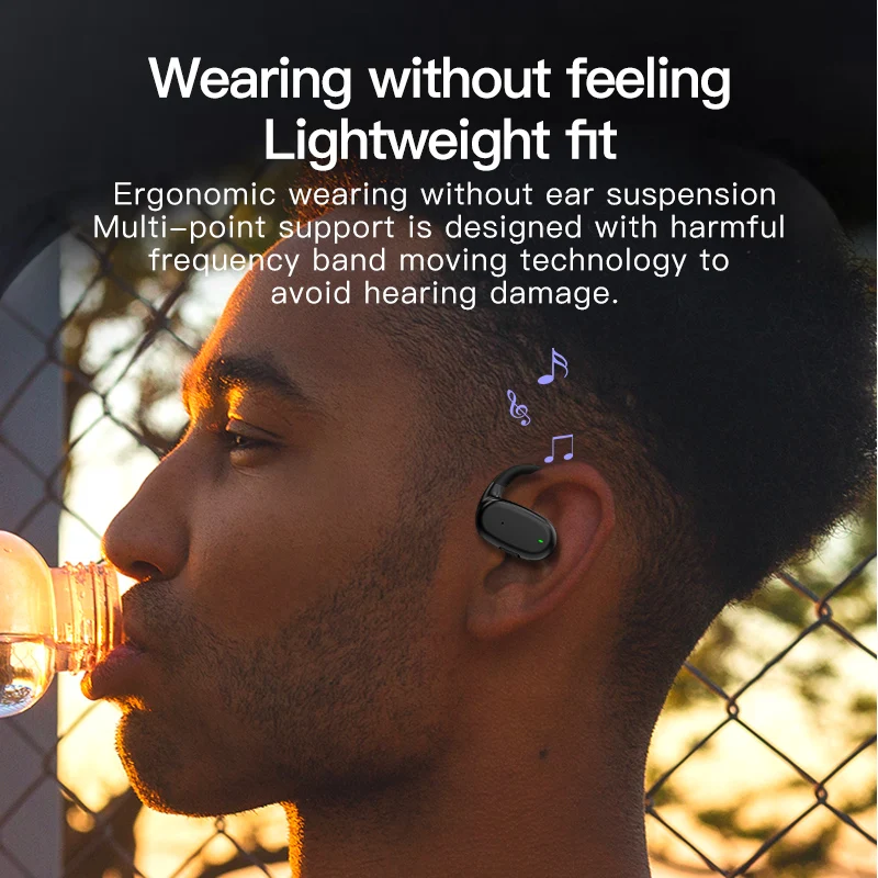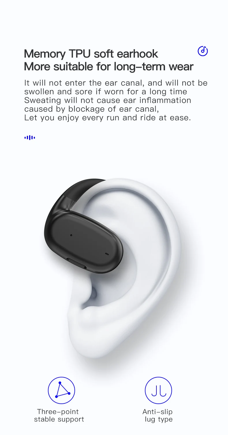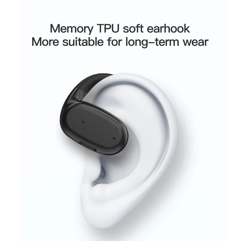 1. Totalmente abierto, diseño sin orejas se ajusta a la ergonomía. El gancho para la oreja suave de TPU tiene un soporte multipunto, que es cómodo y cómodo de llevar.