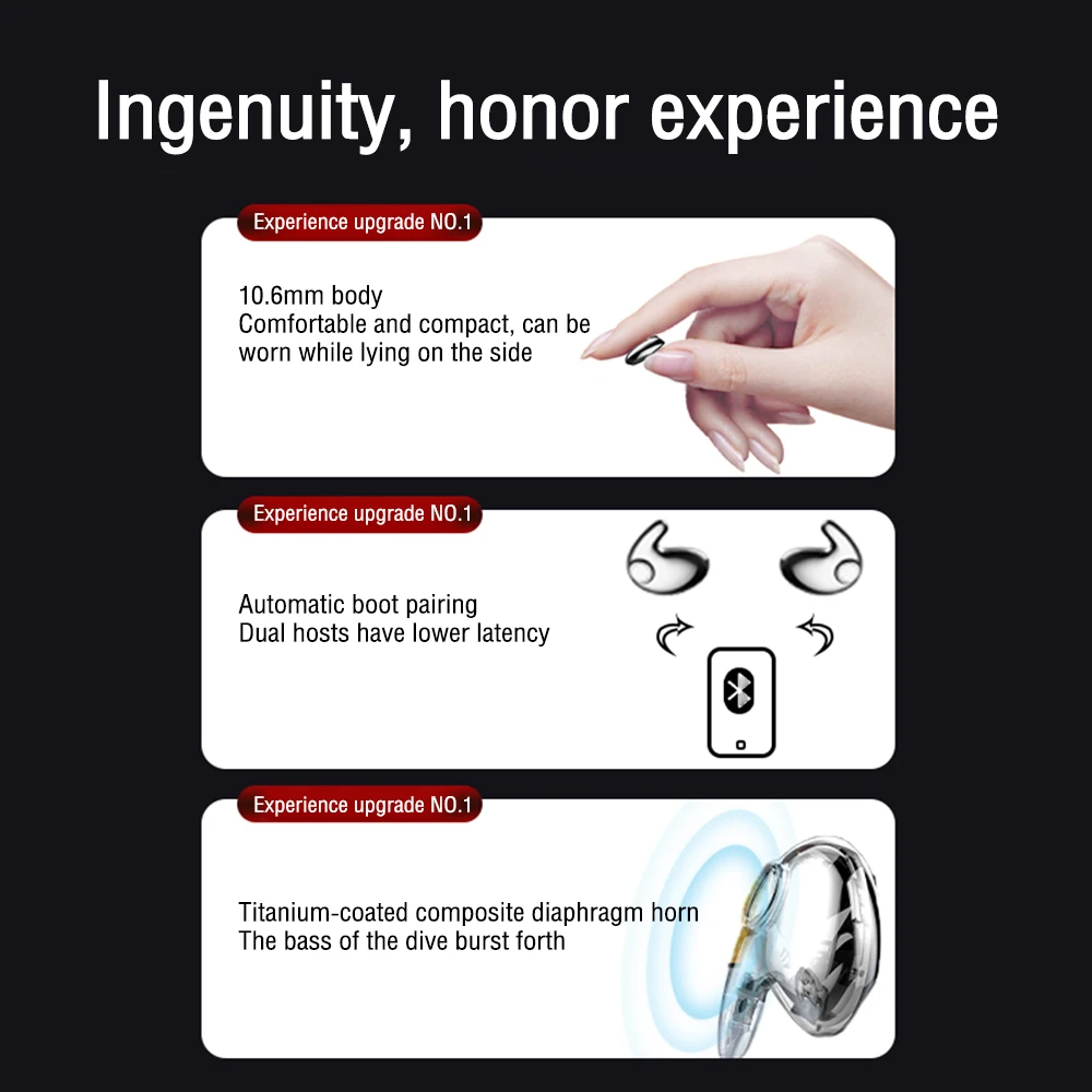 Características:1. Actualizado para ser más Mini, portátil sin sensación, portátil para dormir, contacto con el oído ultrafino, y no se siente oprimido o incómodo cuando se acuesta de lado.2. El efecto de sonido envolvente de 360 ° y la potente Configuración de la unidad crean un sonido envolvente tridimensional de 360 °.3. Compartimento de carga de gran capacidad, batería de larga duración, batería de litio de gran capacidad incorporada. El tiempo de carga es de 1 hora, con un tiempo de reproducción continua de 24 horas cuando se combina con el compartimento de carga, y un tiempo de espera de 480 horas.4. Pantalla digital inteligente de tres pantallas, carga automática, completamente cargada y desconectada, protegiendo la batería. El Nivel de batería de los compartimentos de carga de los auriculares izquierdo y derecho es claro de un vistazo.5. Actualice Bluetooth 5,3 con un núcleo potente con mayor rendimiento, despídase de la desconexión, señal estable, bajo consumo de energía, duración mejorada de la batería, fuerte antiinterferencia y alta velocidad de transmisión.6. La conexión automática simple/doble puede conectar varios teléfonos, equipado con chips de procesamiento dual inteligente. Después de que el teléfono transmite una señal, los auriculares izquierdo y derecho se pueden conectar al mismo tiempo, lo que puede conectar varios teléfonos, retrasando el retraso y sin miedo a la desconexión.7. La reducción de ruido de llamada de alta definición de doble oído es más anti-interferencia, con un nuevo micrófono direccional incorporado, logrando un reconocimiento preciso y una supresión efectiva del ruido externo, haciendo que la comunicación sea más clara.8. Toque el botón para controlar la música/llamadas entrantes a voluntad, haciendo el control simple. Con solo un clic, puede controlar la música, las llamadas entrantes y más. Es realmente inalámbrico.9. IPX5 impermeable y resistente al sudor deportes de compañía, ya sea en el gimnasio o trotar bajo la lluvia, puede acompañarlo con tranquilidad.Especificaciones:Bluetooth: 5,3Rango de transmisión: 10 metrosEstéreo bilateralDuración de la carga: 1hDuración de la batería: 24 horas (con compartimento de carga)Tiempo en espera: 480HLista de embalaje:1 * auriculares1 * cable de carga1 * Instrucciones