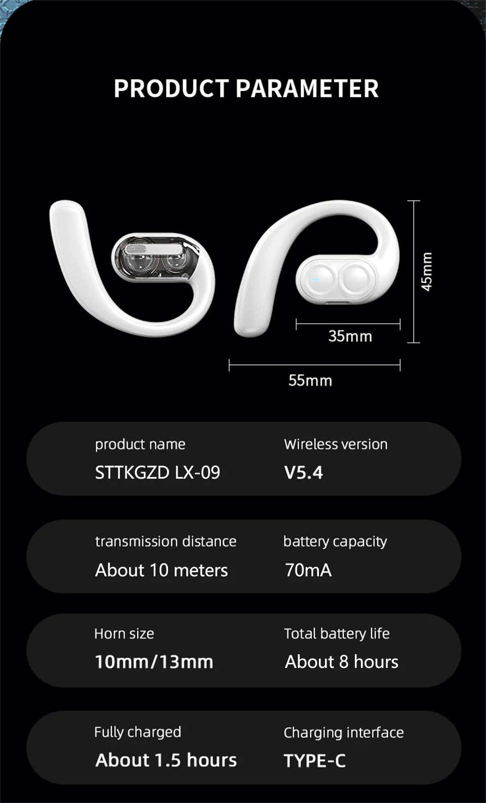 ♬Uso ligero del gancho para la oreja de 8 g:Diseño de curva ergonómica, los auriculares se ajustan a la aurícula y reciben fuerza uniforme.La parte del gancho para la oreja es flexible y elástica, cómoda de usar y no se cae fácilmente.