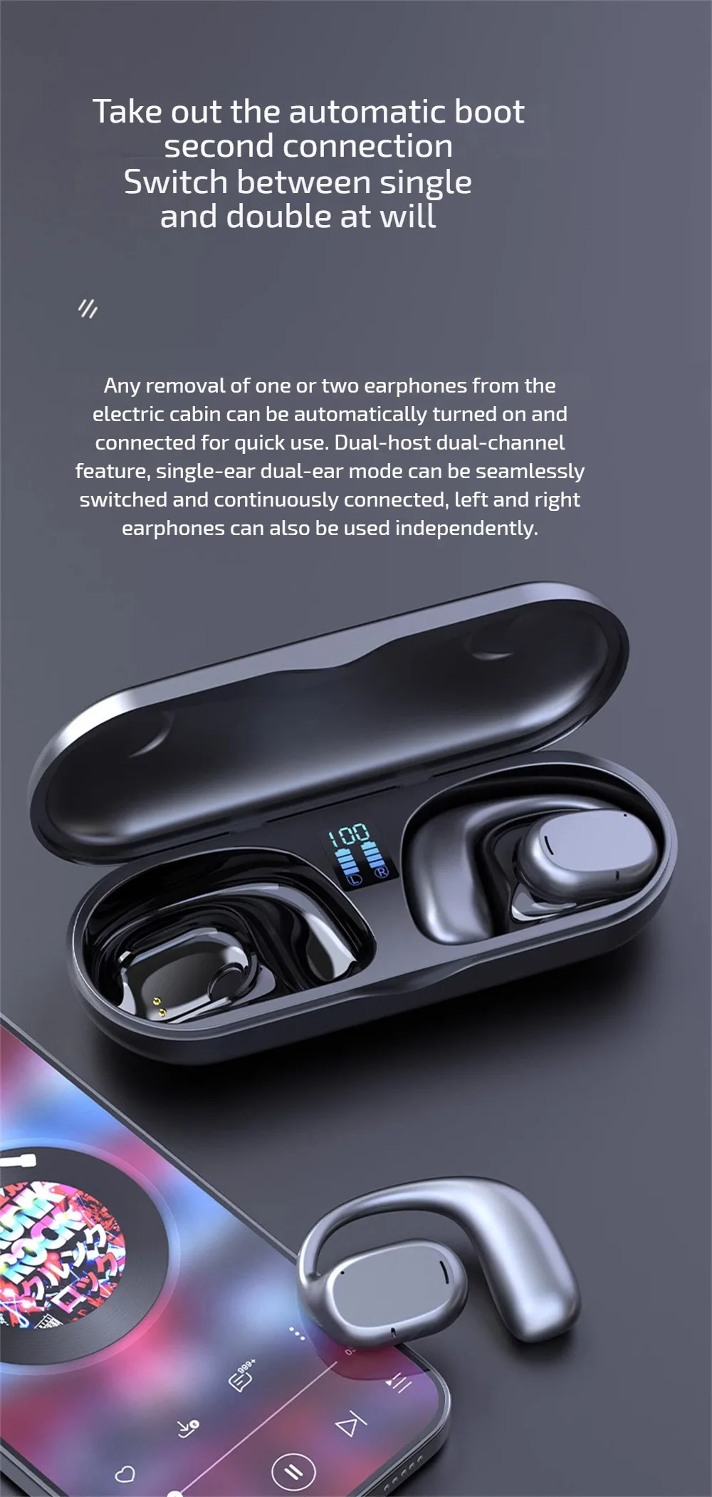 4. Saque el encendido automático y conéctese en segundos: cambie entre simple y doble a voluntad, saque o dos auriculares del compartimento eléctrico a voluntad, Y se pueden encender y conectar automáticamente de forma rápida. Función de doble canal de doble host, el modo de oído único y doble puede ser transparente, el cambio entre los auriculares izquierdo y derecho también se puede usar de forma independiente.