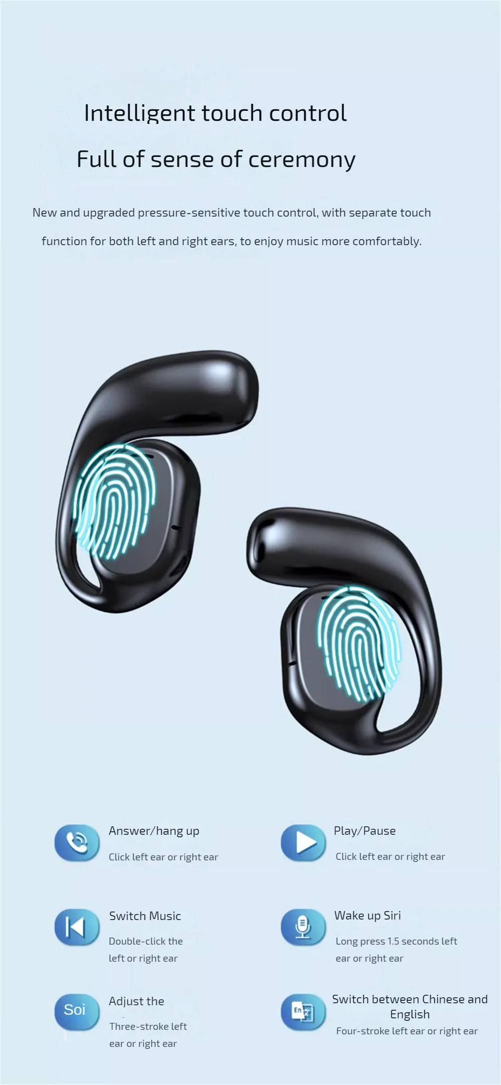 6. Toque inteligente: lleno de sentido de la ceremonia, toque sensible a la presión recientemente actualizado, los oídos izquierdo y derecho tienen funciones táctiles separadas, más cómodo para disfrutar de la música.