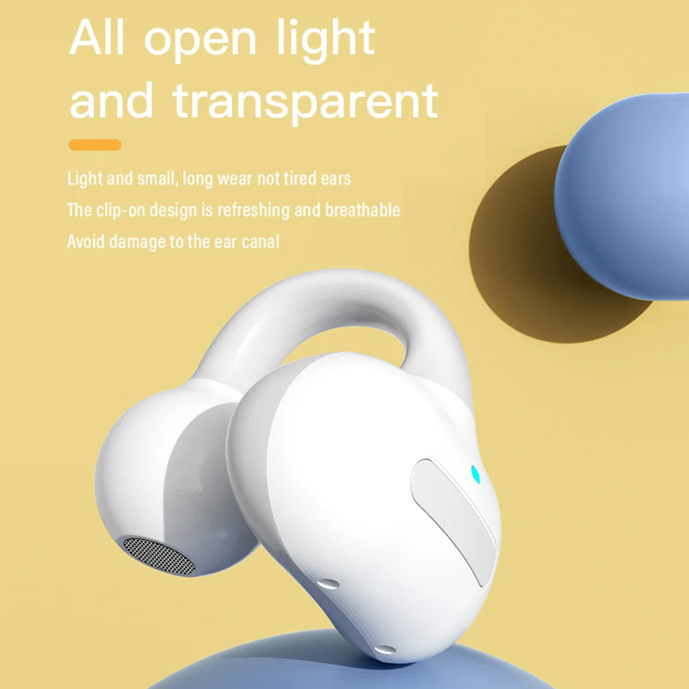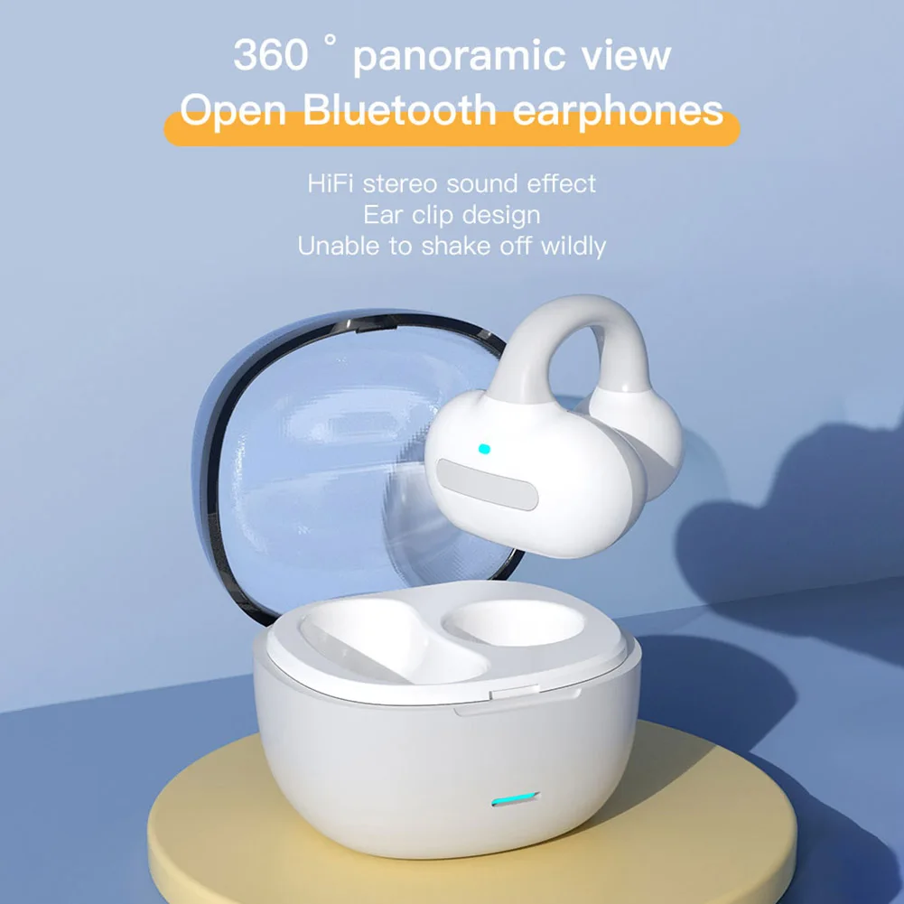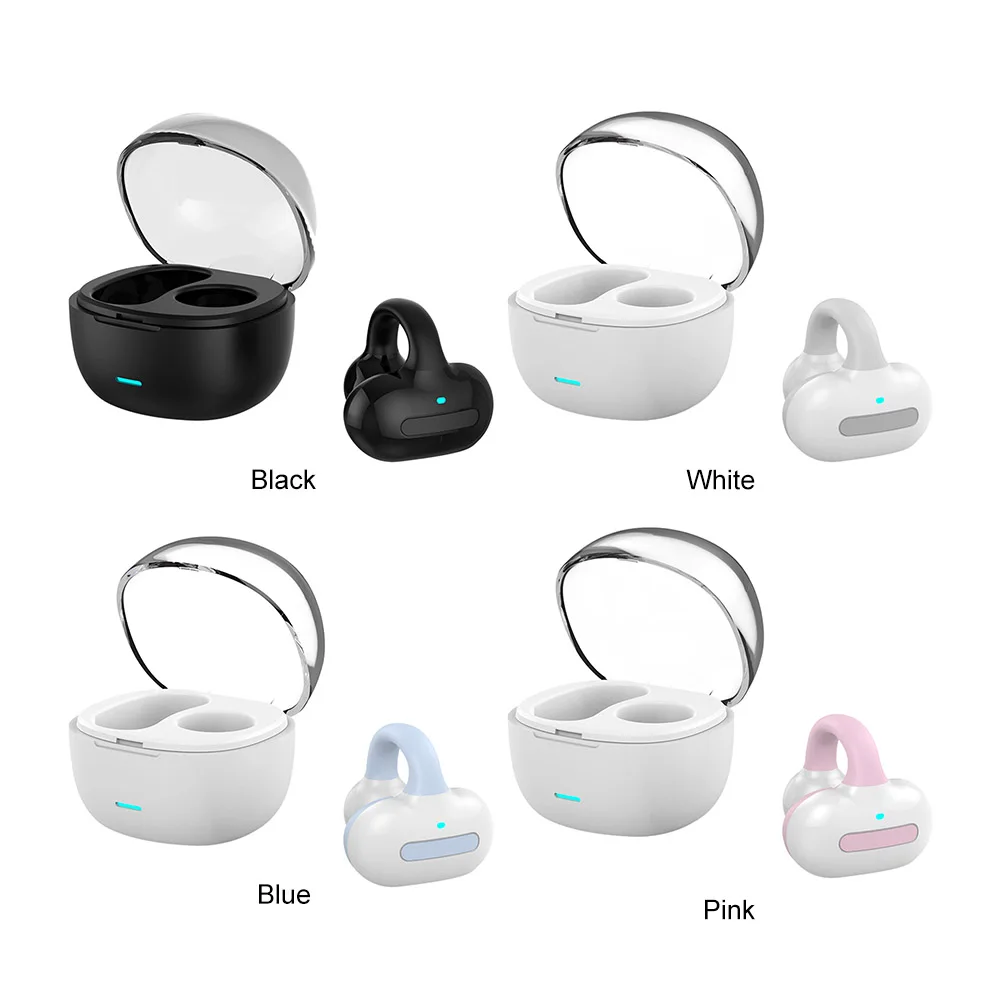 Auriculares con clip para la oreja, auriculares estéreo HiFi con controlador dinámico de 10MM, impermeables, compatibles con BluetoothAuriculares de conducción ósea Característica: 1. Ligero y cómodo:El auricular presenta un diseño liviano que es cómodo incluso para uso prolongado, con un diseño de clip para la oreja que es transpirable y evita daños en el canal auditivo. 2. Cavidad de la estructura acústica:La cavidad de la estructura acústica del auricular, junto con la tecnología de cancelación de ruido y la mejora del sonido digital, proporciona una excelente calidad de sonido con graves profundos y agudos claros. 3. Diseño impermeable:El auricular tiene un cuerpo completamente sellado con componentes internos recubiertos de material impermeable y pines de carga chapados en platino mejorados que resisten la corrosión del sudor. 4. Diseño de clip de oreja:El innovador diseño orientado a la salud del clip para la oreja garantiza que el auricular sea cómodo de llevar sin necesidad de insertarlo en el canal auditivo, por lo que es adecuado para todos los tamaños de oreja. 5. Tecnología de audio avanzada:Con unidades de controlador dinámico de 10mm y Tecnología Avanzada de procesamiento de audio, el auricular ofrece un sonido de calidad HiFi con graves profundos, rango medio completo y agudos nítidos. Especificación: Modelo del producto: Material: ABS Colores: negro, blanco, azul, rosa (opcional) Especificación DE LA BOCINA: bobina dinámica de 10mm Impedancia de bocina: 32 Ω Capacidad de la batería: Estuche de carga 150mAh/auriculares 75mAh Interfaz de carga: Tipo-C Duración de la carga: aproximadamente 1,5 H Tiempo en espera: aproximadamente 130H Tiempo de escucha: aproximadamente 16 horas Distancia de transmisión: 15M Tamaño del embalaje: 92*81*42mm/3,62*3,19*1.65in Peso bruto: 70g Nota: