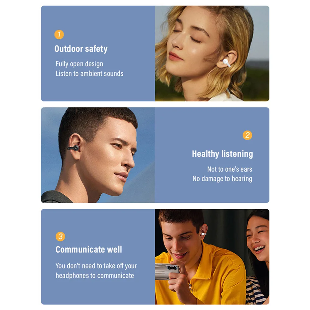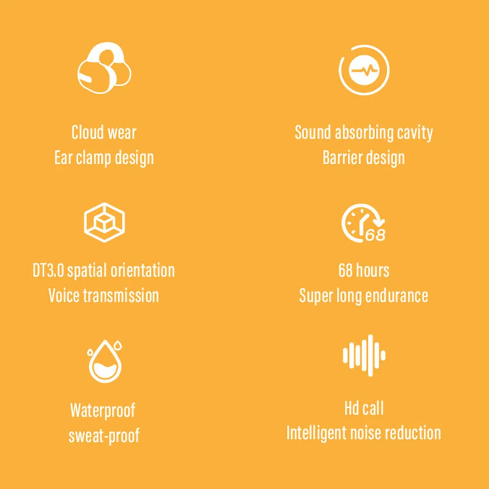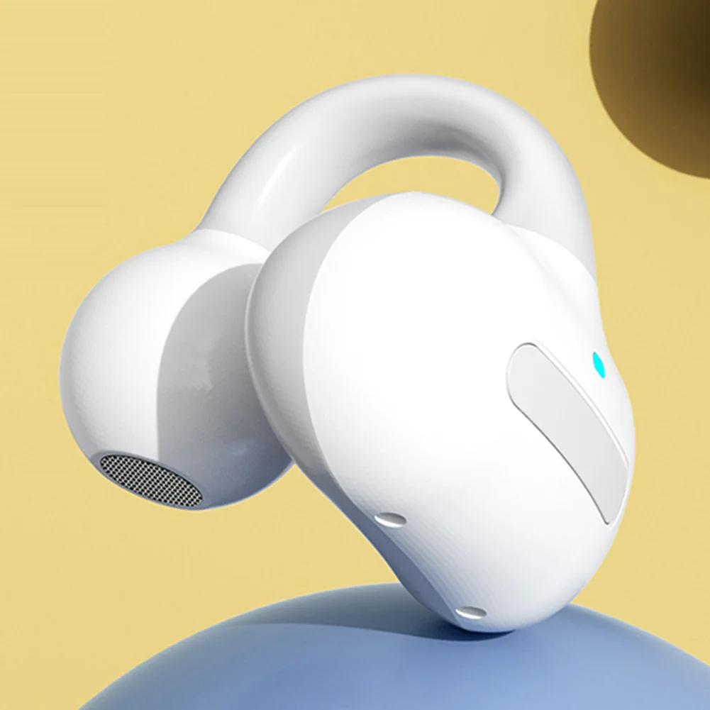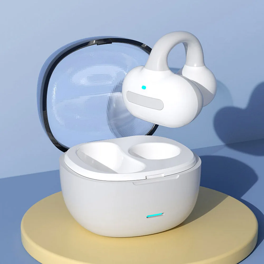 Auriculares con clip para la oreja, auriculares estéreo HiFi con controlador dinámico de 10MM, impermeables, compatibles con BluetoothAuriculares de conducción ósea Característica: 1. Ligero y cómodo:El auricular presenta un diseño liviano que es cómodo incluso para uso prolongado, con un diseño de clip para la oreja que es transpirable y evita daños en el canal auditivo. 2. Cavidad de la estructura acústica:La cavidad de la estructura acústica del auricular, junto con la tecnología de cancelación de ruido y la mejora del sonido digital, proporciona una excelente calidad de sonido con graves profundos y agudos claros. 3. Diseño impermeable:El auricular tiene un cuerpo completamente sellado con componentes internos recubiertos de material impermeable y pines de carga chapados en platino mejorados que resisten la corrosión del sudor. 4. Diseño de clip de oreja:El innovador diseño orientado a la salud del clip para la oreja garantiza que el auricular sea cómodo de llevar sin necesidad de insertarlo en el canal auditivo, por lo que es adecuado para todos los tamaños de oreja. 5. Tecnología de audio avanzada:Con unidades de controlador dinámico de 10mm y Tecnología Avanzada de procesamiento de audio, el auricular ofrece un sonido de calidad HiFi con graves profundos, rango medio completo y agudos nítidos. Especificación: Modelo del producto: Material: ABS Colores: negro, blanco, azul, rosa (opcional) Especificación DE LA BOCINA: bobina dinámica de 10mm Impedancia de bocina: 32 Ω Capacidad de la batería: Estuche de carga 150mAh/auriculares 75mAh Interfaz de carga: Tipo-C Duración de la carga: aproximadamente 1,5 H Tiempo en espera: aproximadamente 130H Tiempo de escucha: aproximadamente 16 horas Distancia de transmisión: 15M Tamaño del embalaje: 92*81*42mm/3,62*3,19*1.65in Peso bruto: 70g Nota: