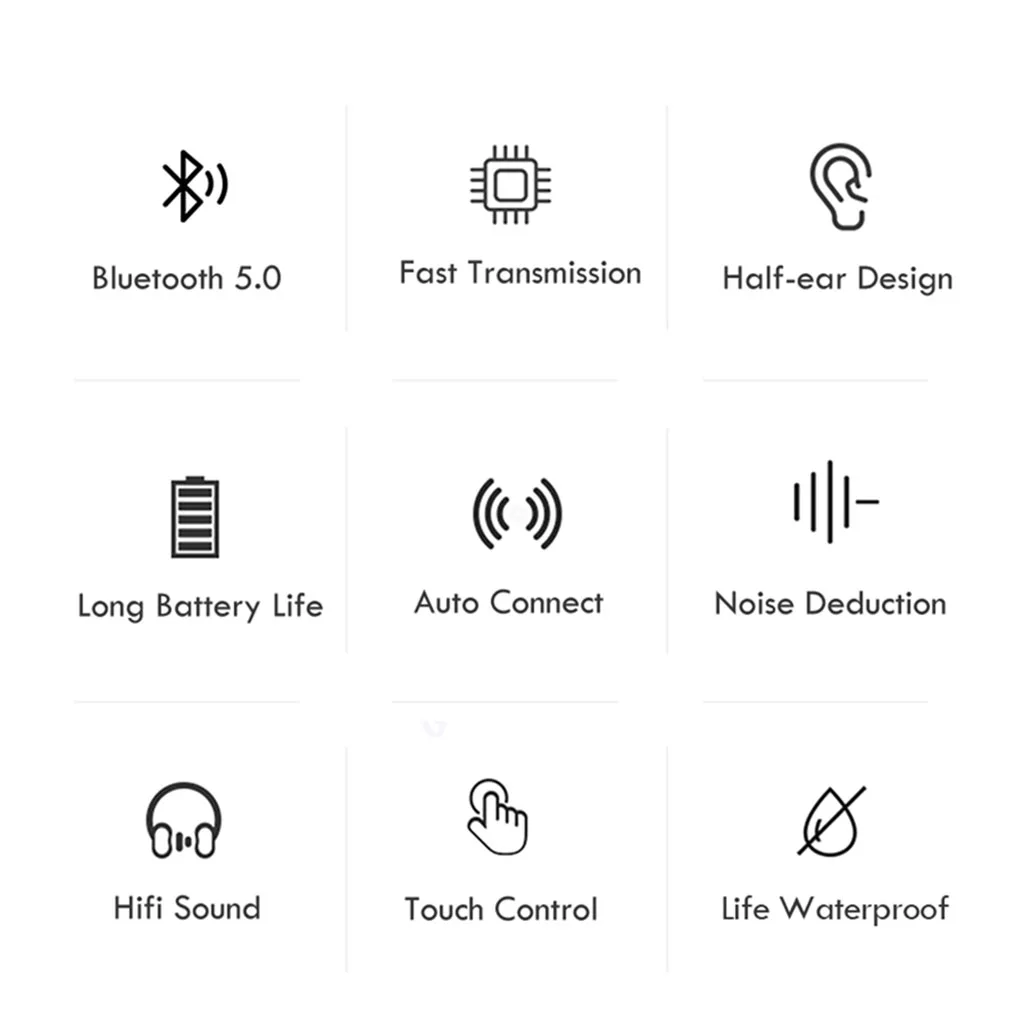 Descripción: Bluetooth V5.0, compatible con la mayoría de los dispositivos Bluetooth y reduce el consumo de energía. La caja de carga de 400mAh puede cargar completamente 2 pares de auriculares aproximadamente 4 veces, proporcionando más 24 horas de tiempo de reproducción de música. Utilizando tecnología impermeable, ya no tendrá que preocuparse por el agua y el sudor. Con unidad de accionamiento dual de 13mm, disfrute de la potente música de graves profundos 9D. Función táctil popular, soporte para cambiar canciones, llamar y llamar al asistente de voz.