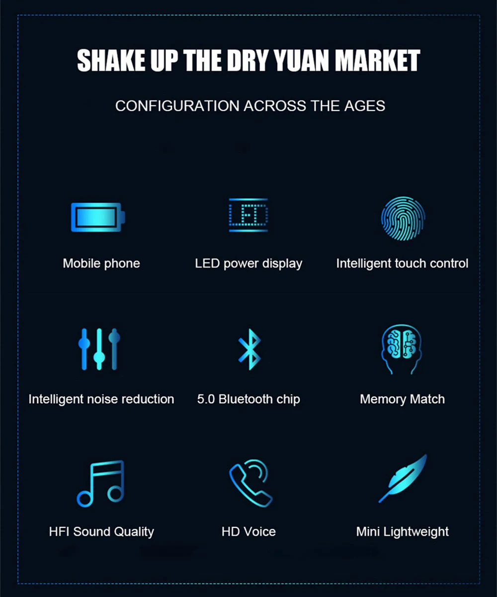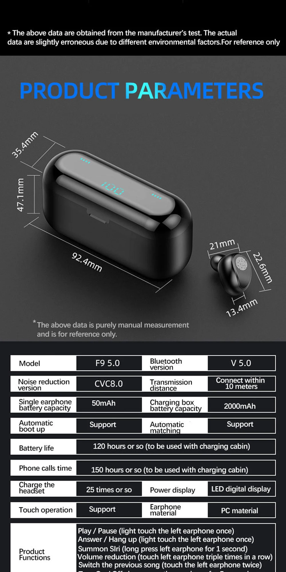 Características del producto:1. Bluetooth V5.0, compatible con la mayoría de los dispositivos Bluetooth y menor consumo de energía2. El ESTUCHE DE CARGA DE 2000mAh puede cargar completamente 2 auriculares alrededor de 10 veces, ofreciendo más tiempo de música.3. Con tecnología impermeable, ya no hay necesidad de preocuparse por el agua y el sudor4. Unidades de doble Unidad de 8MMS, disfruta de un fuerte sonido de música de graves profundos 9D5. Función de control popular de un botón, admite cambiar canciones, llamada telefónica y asistente de voz de llamada.Listas de paquetes:2 * Auriculares Bluetooth1 estuche de carga1 * Cable USB1 * Manual de usuario2 * tazas para auriculares (tamaño L,M)