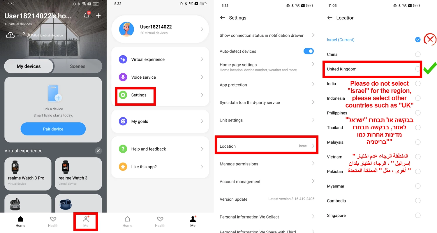 Recuerde amablemente:Para los usuarios en Israel, antes de conectar realme air 5 pro en el software de enlace realme, cambie la región en la configuración a otra región (como "Reino Unido"), de lo contrario, el modelo realme air 5 pro no se puede encontrar en realme enlace.