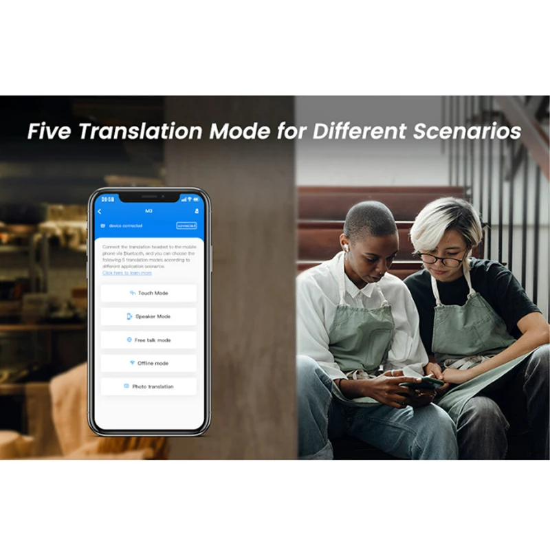 【 Cinco modos de traducción para cualquier escenario de comunicación】 Los auriculares de traducción M3 ofrecen cinco modos de traducción diferentes para adaptarse a una variedad de escenarios de comunicación. Ya sea que necesite usar el modo táctil, el modo de altavoz, el modo de conversación libre, el modo sin conexión o la traducción de fotos, estos auriculares garantizan que pueda comunicarse de manera clara y efectiva en cualquier situación.