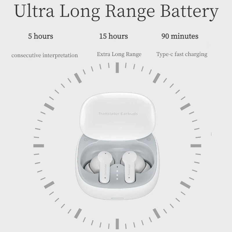 【Batería de larga duración, comunicación ininterrumpida】Cuando se usan con el estuche de carga, los tapones para los oídos tienen una duración de batería de 15 horas, lo que le permite usarlos durante mucho tiempo sin interrupciones. Además, los auriculares pueden traducirse continuamente hasta 5 horas, perfectos para viajes largos o largos períodos de tiempo. Con esta larga duración de la batería, puede confiar en que los auriculares proporcionarán una comunicación ininterrumpida.