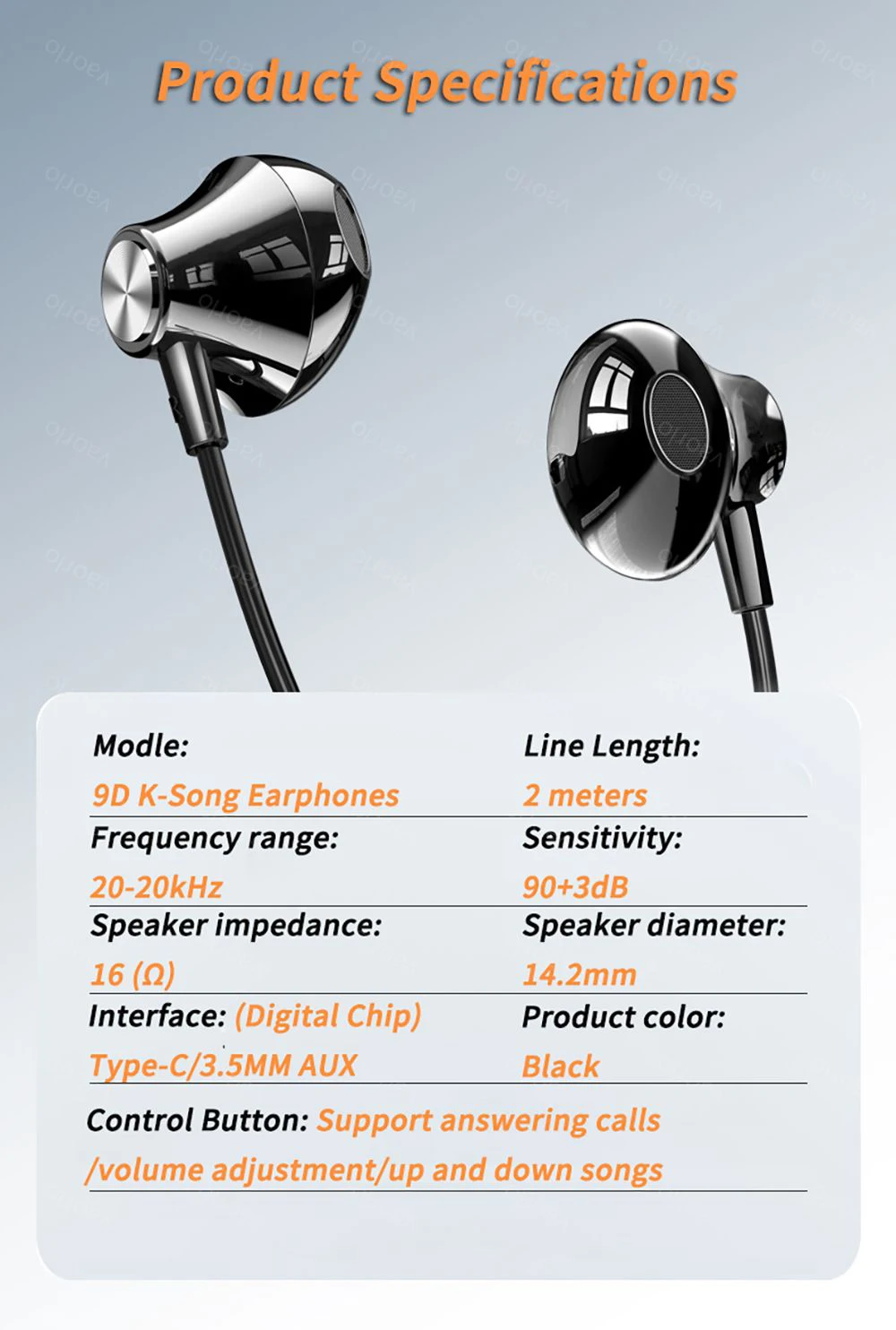 1x auriculares con cable K-Song de graves pesados HiFi 9D (2 metros de longitud)
