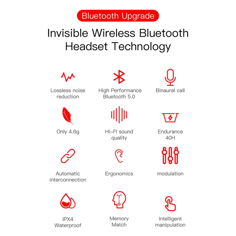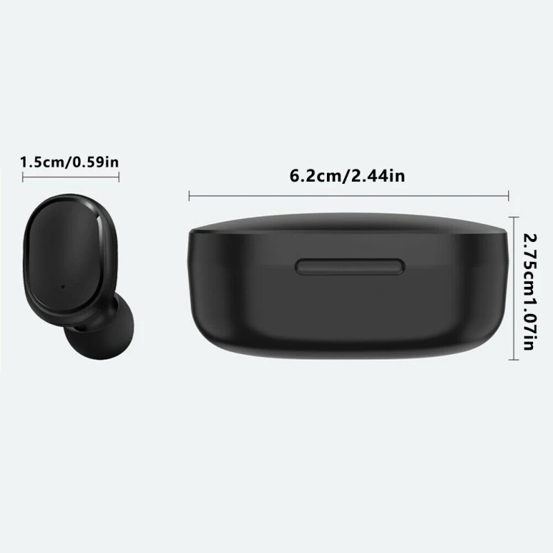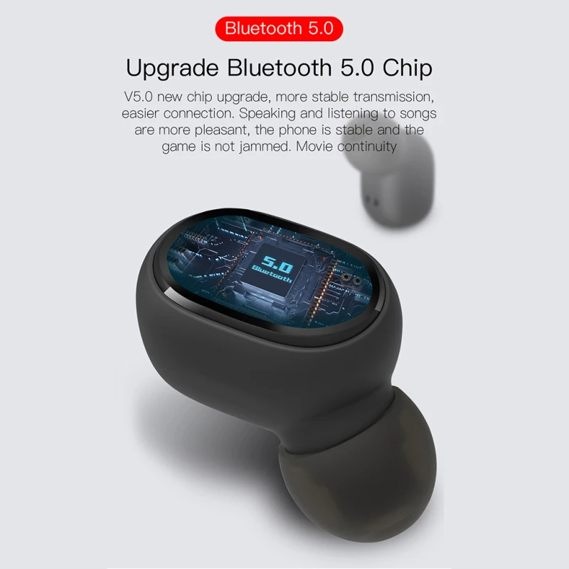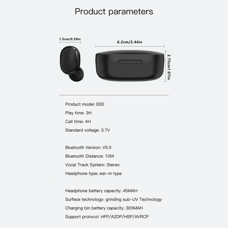Este auricular Bluetooth es adecuado para todos los dispositivos compatibles con Bluetooth, como teléfonos, ordenadores portátiles y otros.La caja de carga portátil es conveniente para llevar y cargar los auriculares, y se puede utilizar durante mucho tiempo cuando está completamente cargada.Está diseñado con un micrófono incorporado, que admite llamadas manos libres, puede responder o rechazar las llamadas con una sola mano, asegurándose de su seguridad al conducir.Puede usar el auricular izquierdo y derecho al mismo tiempo, y puede compartirlo con otros, pero si usa los 2 auriculares al llamar, solo el auricular principal podría escuchar el sonido al llamar, si usa los auriculares por separado, ambos auriculares podrían escuchar el sonido con claridad.Este auricular está diseñado con tecnología Bluetooth V5.0, que funciona con una conexión estable y fácil transferencia, puede llamar a otros sin problemas y le proporciona un sonido estéreo y claro, dándote un agradable disfrute musical.Está diseñado con una pantalla LED inteligente, conveniente para que usted sepa la cantidad de electricidad.Especificación:Material: plástico.Color: negro.Tamaño: Caja de carga: 62*27,5mm.Versión de Bluetooth: V5.0.Distancia de transferencia: 10m.Tiempo de carga: alrededor de 1-2h.Tiempo de reproducción de música: aproximadamente 3h.Batería del auricular: 45mAh.Batería de la caja de carga: 300mAh.Formato de transferencia de audio: HFP / A2DP / HSP / AVRCP.Impermeable: IPX4.Nota:Debido a la diferencia de luz y pantalla, el color de los artículos puede ser ligeramente diferente al de las imágenes.Permita una ligera desviación en los datos de medición y asegúrese de que no le importa antes de realizar el pedido.Paquete incluido:1x par de auriculares.1 cable USB.1 Introducción.