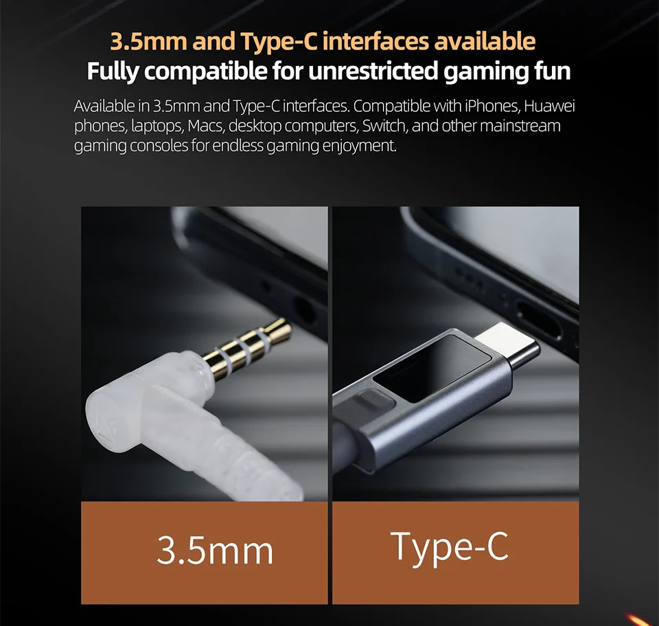 Elija entre dos tipos de enchufes: 3,5 mm/Tipo C, Switch, teléfonos móviles, computadoras portátiles, computadoras de escritorio y controladores PS/Xbox son plug and play.