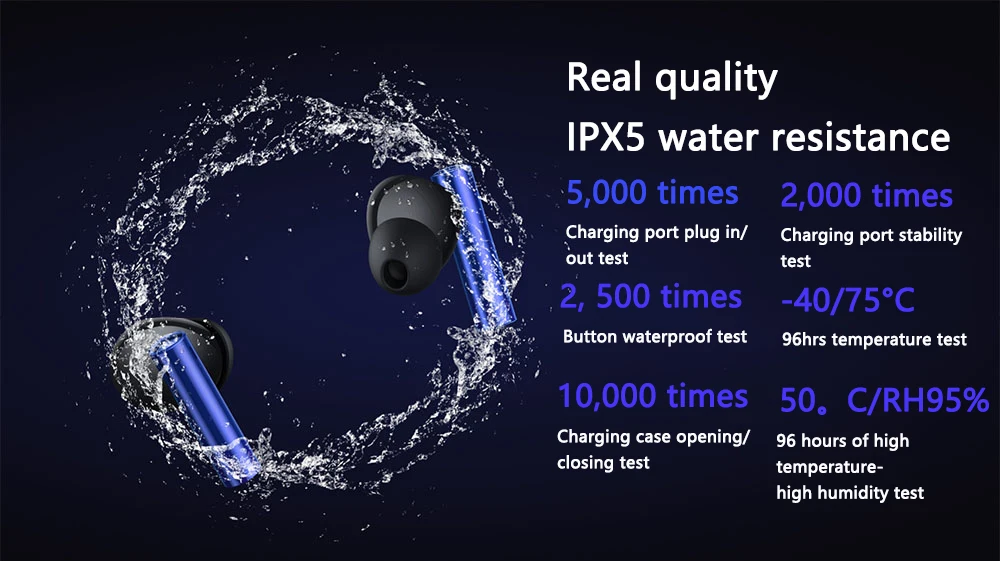 5. Solo los auriculares están certificados para IPX5 a prueba de polvo y agua y no el estuche de carga. Se recomienda evitar el uso de los auriculares durante los deportes extremos para evitar daños por la penetración del sudor.