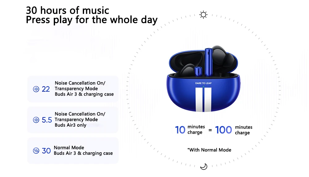 2. Los datos de duración de la batería de los Buds Air 3 se obtienen de los laboratorios, consulte la tabla de parámetros anterior para obtener más detalles. Dado que el resultado de la prueba se ve afectado por el entorno de prueba, consulte el elemento real.