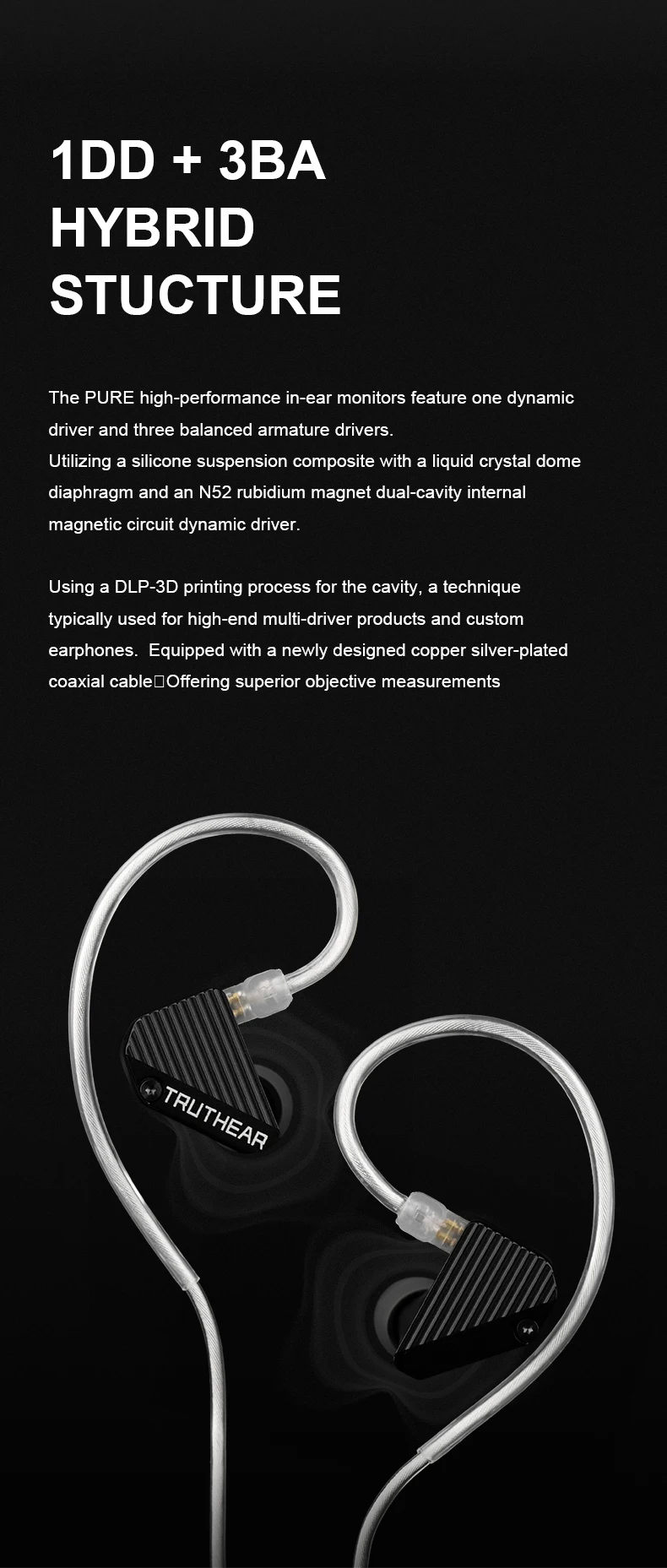 Utilizando un proceso de impresión DLP-3D para la cavidad, se utiliza tecnicamente para productos multiconductores de alta gama y auriculares personalizados.Equipado con un cable coaxial de cobre plateado de nuevo diseño que ofrece mediciones objetivas superiores
