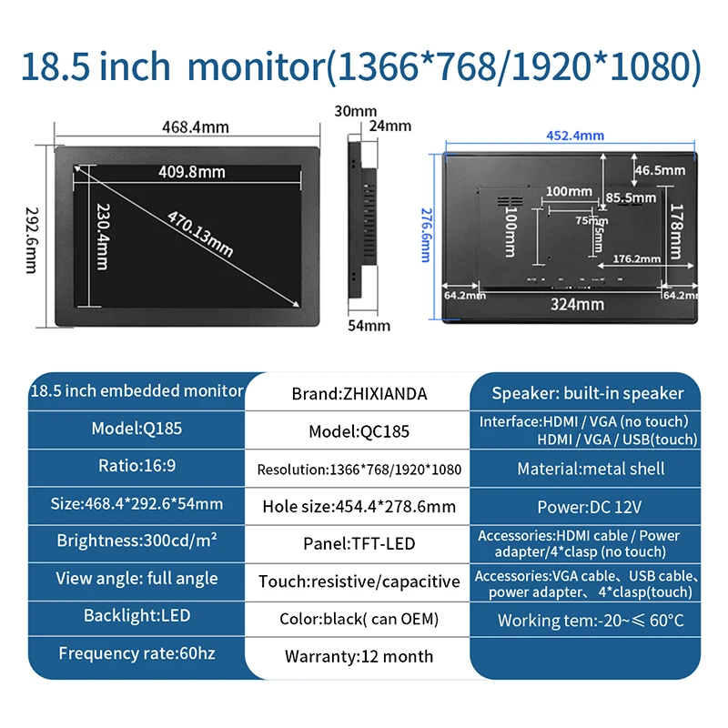 Las especificaciones del monitor integrado con carcasa metálica 16:9 de 18,5 pulgadas