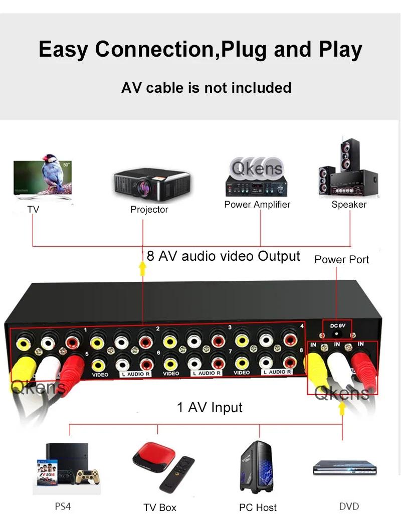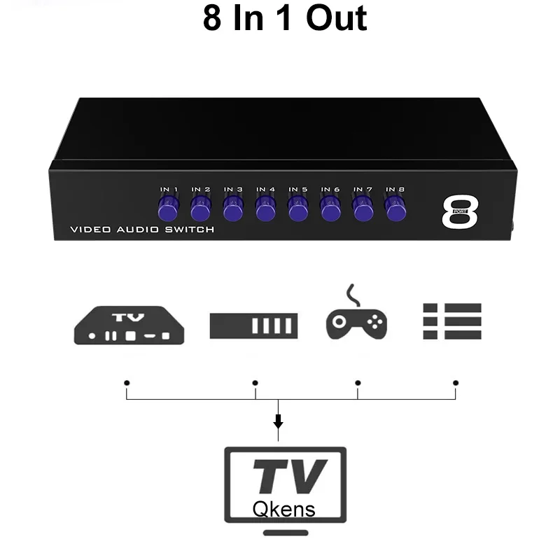 Nuevo y de alta calidad, ¡Compre con confianza! 1x8: AV 1 canal de entrada, 8 canales de salida 8x1: entrada AV de 8 canales, salida de 1 canal Plug and Play Tamaño: aprox. 22x9x3,9 cm