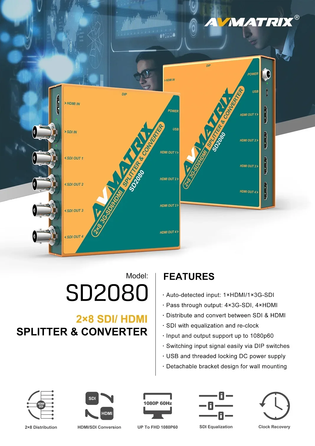 AVMATRIX SD2080 2×8 HDMI/SDI convertidor divisor distribuidor para aplicaciones de posproducción de audio y vídeo