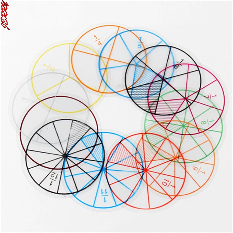 Ronde fraccie bevatten 1, 1/2, 1/3, 1/4, 1/5, 1/6, 1/8, 1/10, 1/11 en 1/12, totaal 51 stuks van magnetische segmenten met nummers op.