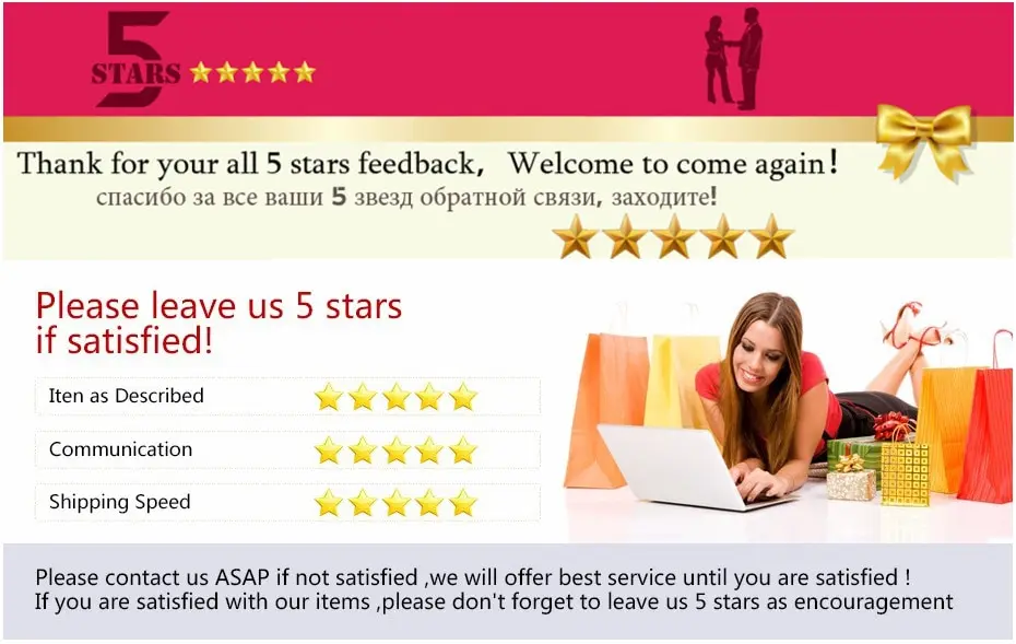 1. Si está satisfecho con nuestros productos y servicios, Deje su comentario positivo y 5 estrellas.