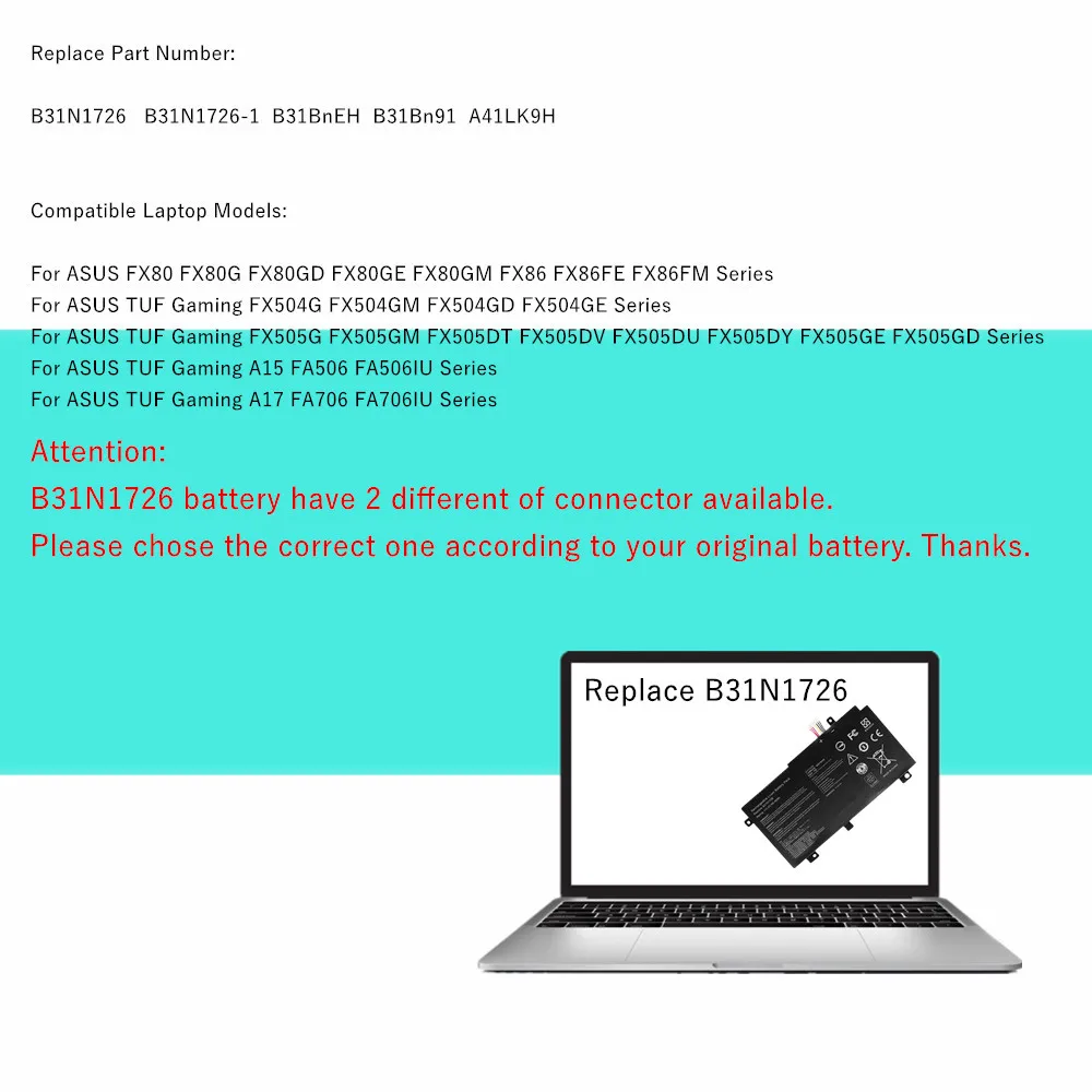La batería B31N1726 tiene 2 conectores diferentes disponibles. Elija el correcto según su batería original. Gracias.