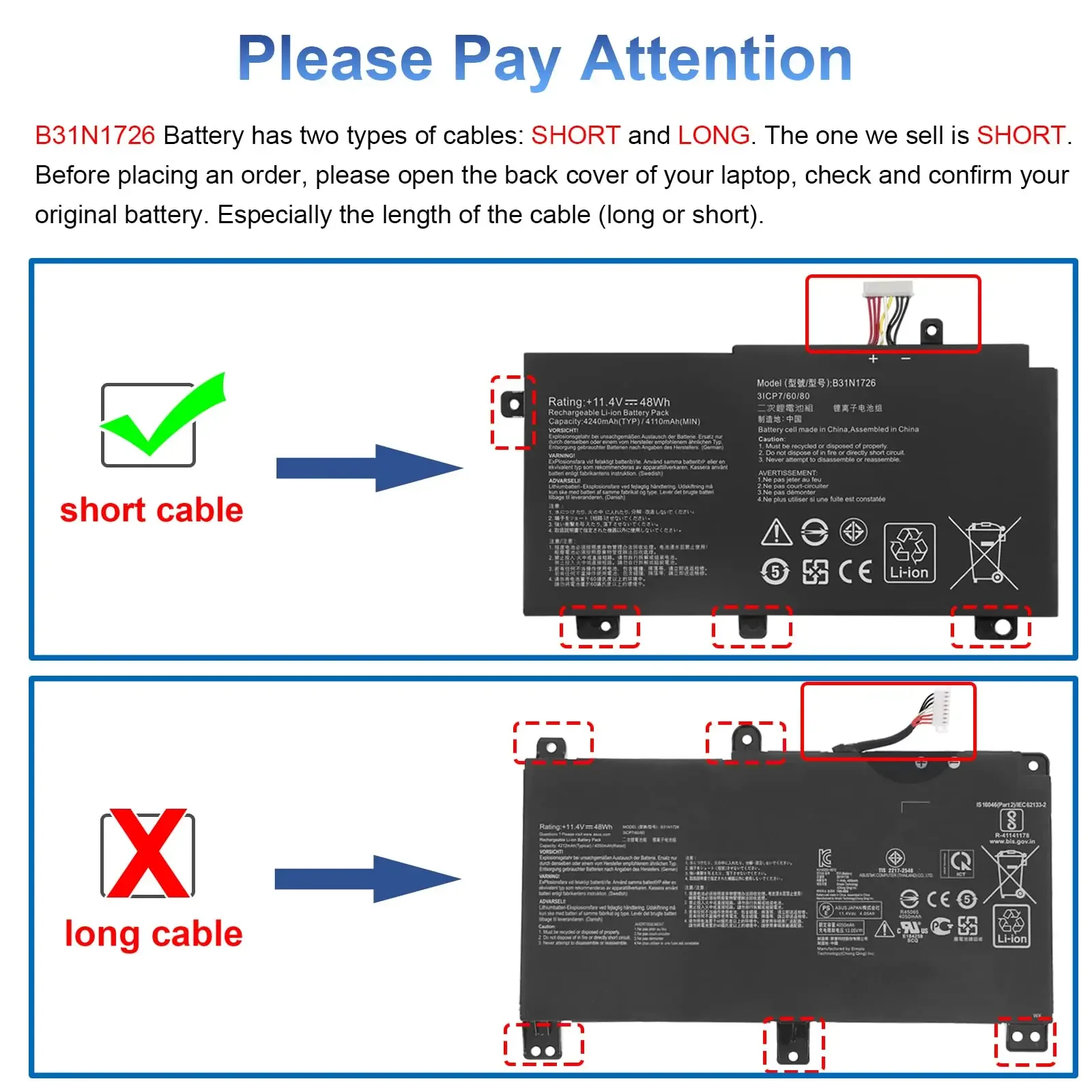 Por lo tanto, antes de realizar un pedido, abra la tapa trasera de su ordenador portátil, verifique y confirme su batería original y compárela con nuestras imágenes de la batería para asegurarse de que esto sea lo que necesita. Especialmente la longitud del cable (largo o corto).