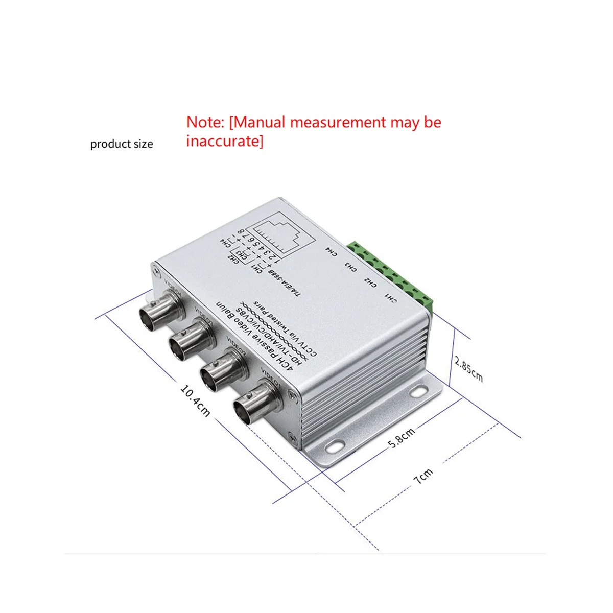 100% nuevo y de alta calidad Video Balun pasivo para AHD CVI TVI Max 1080P Las señales de video de 4 cámaras diferentes se pueden transmitir a través de un solo cable de red RJ45 Video balun le permite reducir los costos de material e instalación cuenta con 4 Conectores BNC hembra a bloque de terminales de 8 pines BNC hembra, Conéctese directamente a su cámara CCTV con conector macho BNC, no necesita adaptador. Transmisión de señal de vídeo a través del cable UTP Lan. Se puede utilizar como receptor y como transmisor. Distancia máxima de trabajo de vídeo a color de 450m cuando se utiliza con transceptor de vídeo UTP pasivo. Diseño pasivo (no requiere alimentación). Protección de supresión de transitorios incorporada Instalación rápida y fácil, no requiere energía. Color: Como se muestra Material:Metal Contenido del paquete: 1 x Video Balun Solo el contenido del paquete anterior, otros productos no están incluidos. Nota: El reflejo de la luz y las diferentes pantallas pueden hacer que el color del elemento en la imagen sea un poco diferente del real. El error de medición permitido es +/- 1-3cm.