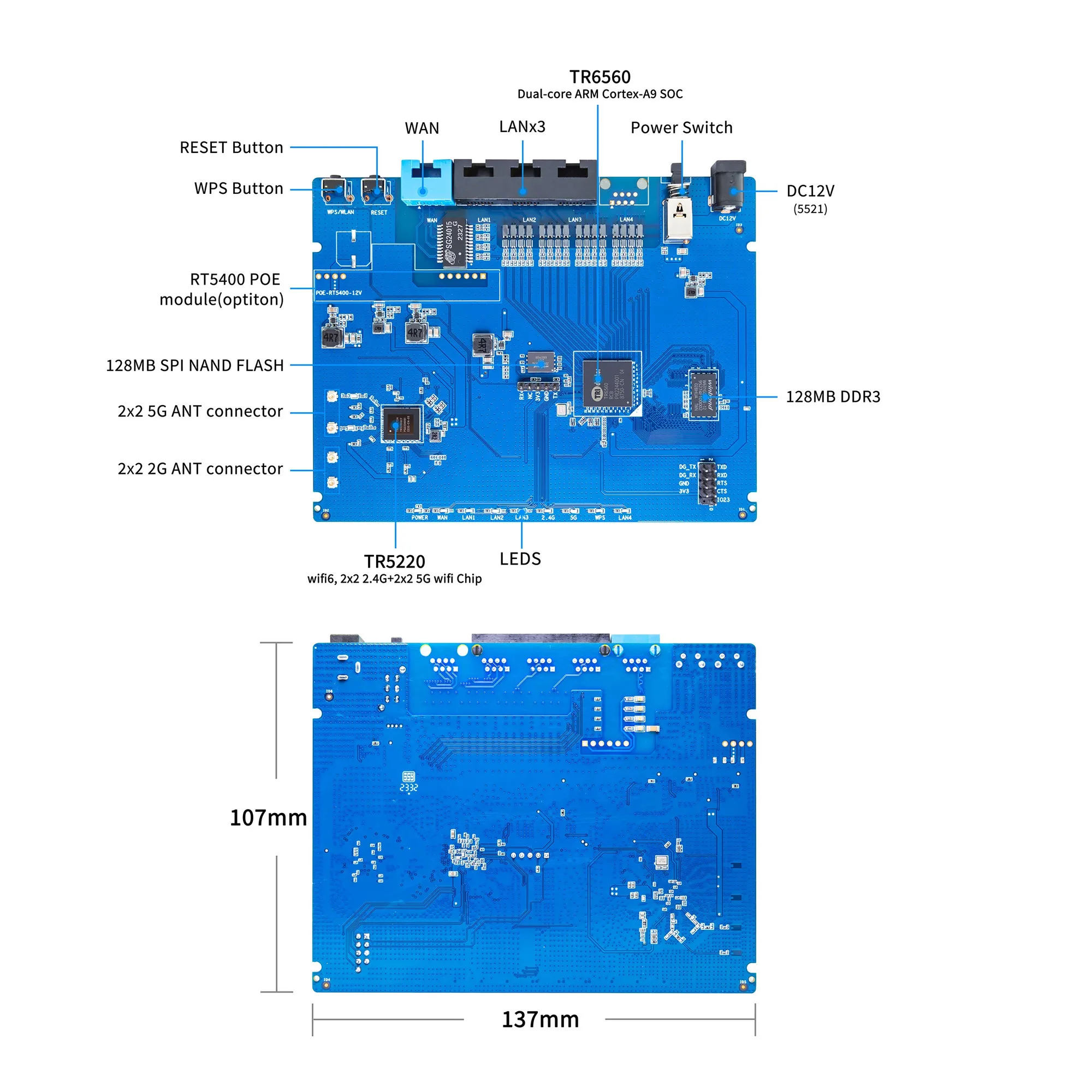 Enrutador Banana Pi con diseño de trductor TR6560 + TR5220 WiFi SOC, es una solución de enrutador wifi6 estándar. Procesador ARM Cortec A9 de doble núcleo de alto rendimiento incorporado para reenvío de mensajes WIFI o procesamiento comercial inteligente, LSW integrado de alto rendimiento y NAT de hardware, admite hasta 5Gbps de reenvío de mensajes, PHY 5GE integrado, un RGMII, admite un puerto de expansión RGMII, proporciona una capacidad de acceso a la red de 1000Mbps y admite dos puertos WAN. Admite QoS inteligente de hardware. Compatible con doble banda 2,4G 40M 2*2 + 5G160M2.2 DBDC WIFI, versión de protocolo Wifi compatible con IEEE 802.11ax, compatible con versiones anteriores 802.11a/B/g/n/AC, puede soportar la tasa más alta de 3Gbps, 2G alcanzará los 573,5 Mbps, mientras que 5G alcanzará los 2401,9 Mbps, admite interfaz PoE, agrega un módulo PoE para admitir la función PoE.