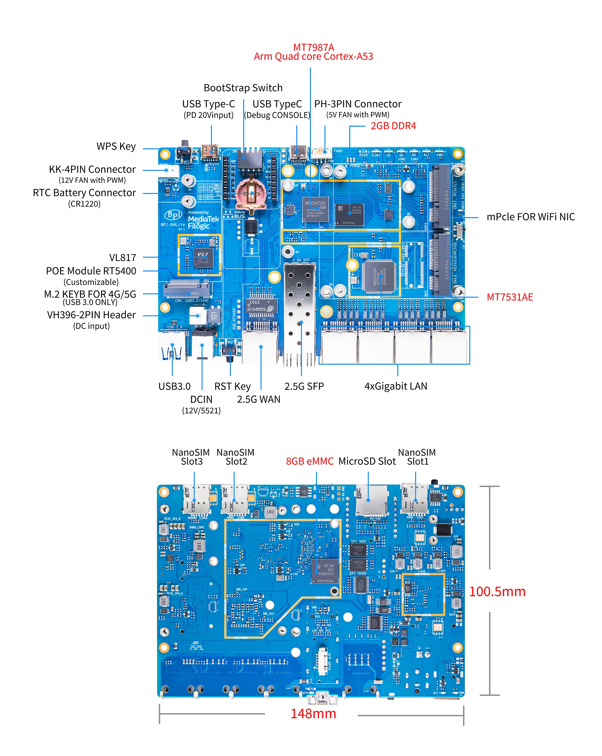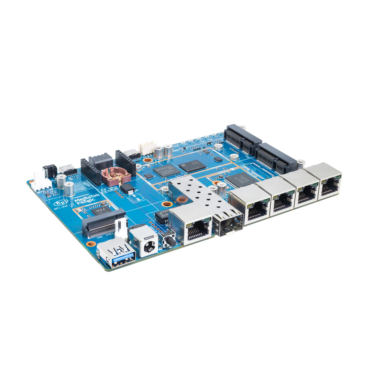 Diseño de placa de enrutador inteligente Banana Pi BPI-R4 Lite con Arm Cortex-A53 de cuatro núcleos MediaTek MT7987A, admite 2 GB DDR4 y 8G eMMC Flash a bordo.1 SFP de 2,5G y 1 WAN RJ45 de 2,5G, compatible con puerto LAN RJ45 de 4 x 1G.Admite M.2 para módulo 4G/5G. 1 ranura miniPCIe con interfaz PCIe3.0 de 2lanes para Wi-Fi 7 NIC.