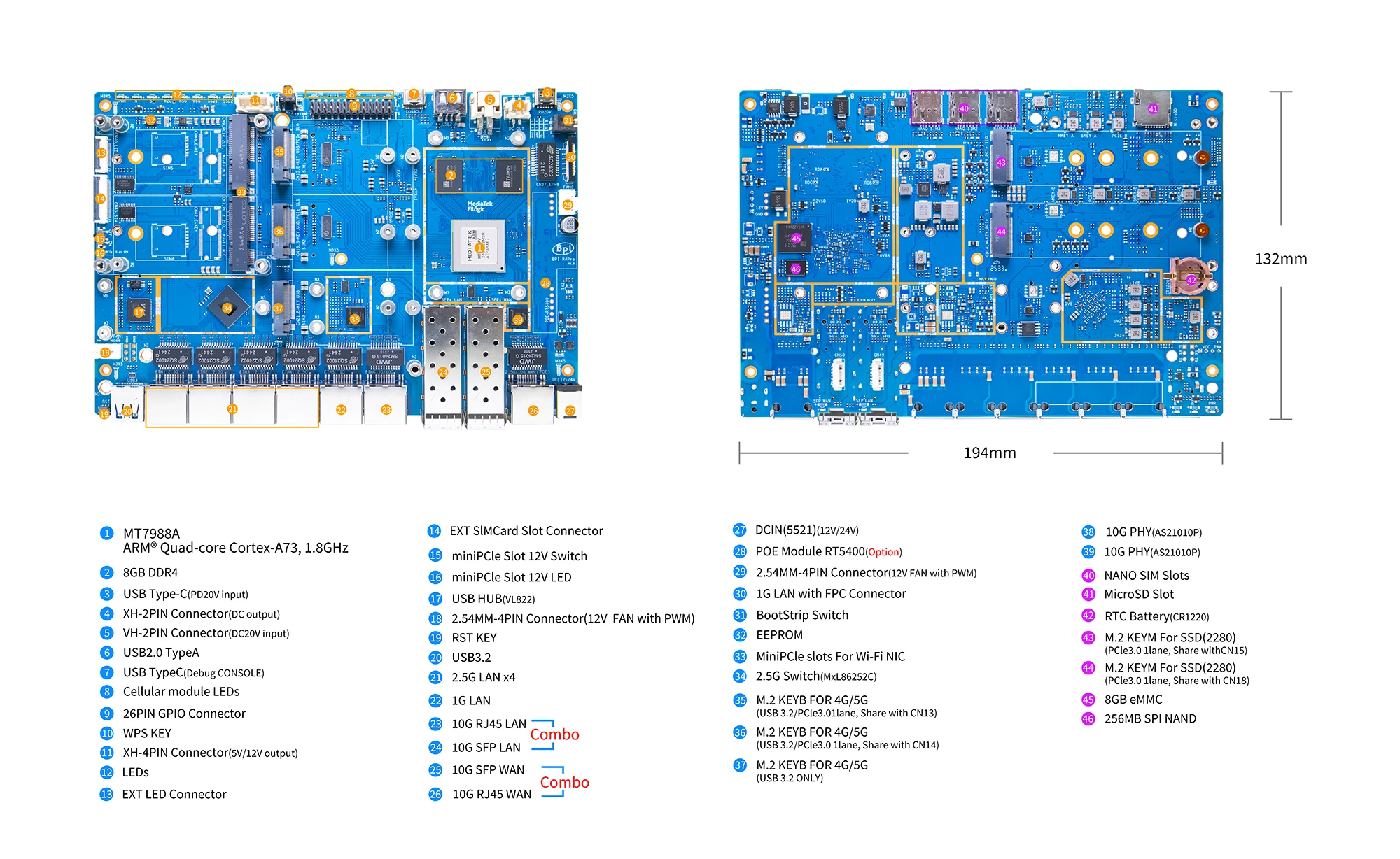 MediaTek MT7988A es un procesador de red de clase mundial diseñado para redes confiables y de alto rendimiento en aplicaciones tanto por cable como inalámbricas.Ofrece un conjunto completo de interfaces de conectividad, que incluyen cuatro puertos Gigabit Ethernet, dos interfaces USXGMII, cuatro interfaces PCIe y dos puertos USB 3.2 Gen 1.