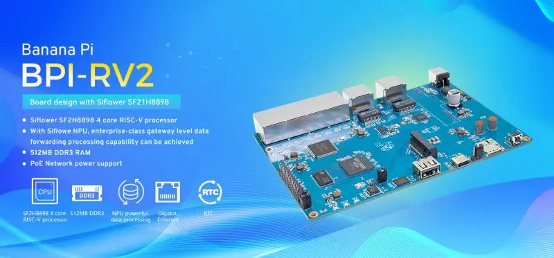 La puerta de enlace de código abierto Banana Pi BPI-RV2 es un dispositivo basado en Siflower SF21H8898 SoC, interfaz de red WAN de 1 × 2,5 G, interfaz de red LAN de 5 Gigabit, memoria DDR3 integrada de 512 MB, 128 MiB NAND, 16 MiB NOR, interfaz M.2, MINI PCIE e interfaz USB 2.0, etc.