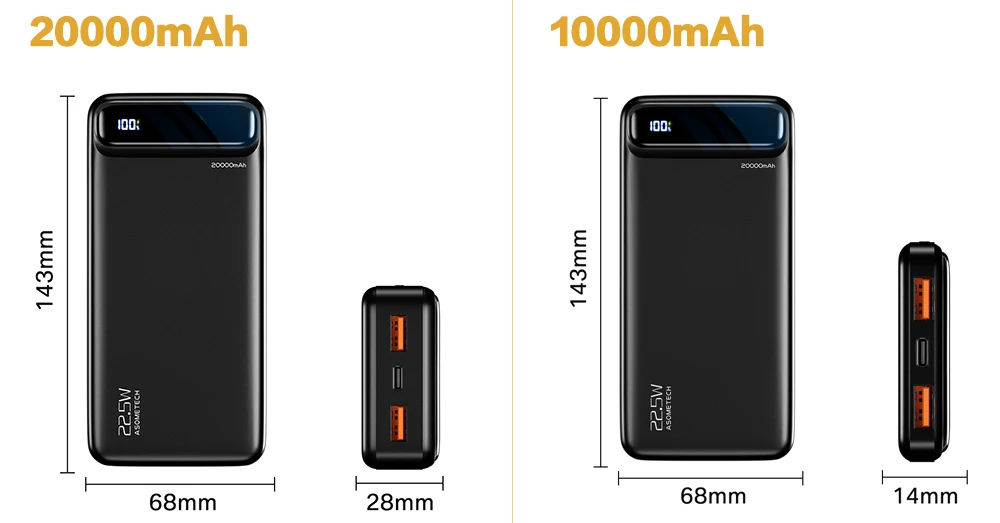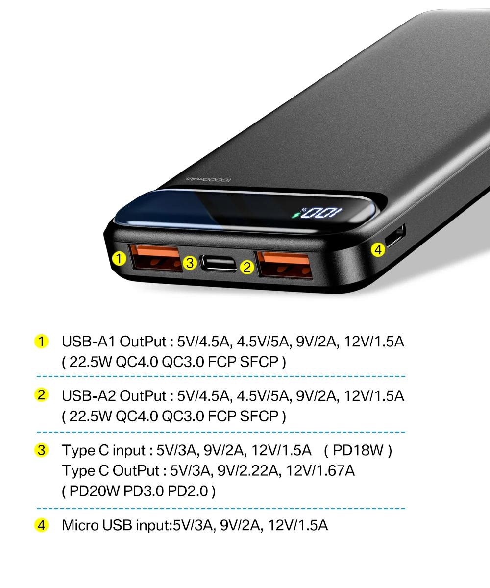 Modelo: AS1WCapacidad de la batería: 10000 mAh/3,7 V (37 WH)Potencia: 22,5 W máx.Entrada tipo C: 5 V/3 A, 9 V/2 A, 12 V/1,5 A (entrada rápida PD18 W)Entrada micro USB: 5 V/3 A, 9 V/2 A, 12 V/1,5 A (QC3.0)Entrada USB-A 1/2: 5 V/4,5 A, 4,5 V/5 A, 9 V/2 A, 12 V/1,5 A (22.5 W)Salida tipo C: 5 V/3 A, 9 V/2,22 A, 12 V/1,67 A (PD20 W)USB-A1+USB-A2: 5V3A máx.USB-A1+USB-A2+USB-C: 5V3A máx.Acuerdo de carga rápida: QC3.0, QC2.0, PD3.0, PD2.0, FCP, AFC, SFCPBanco de energía de 22,5 W 20000 mAh