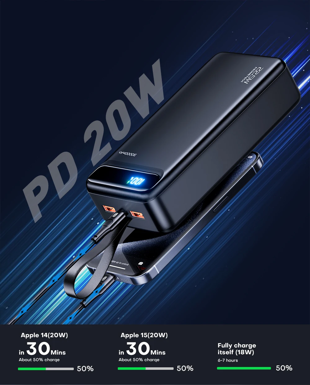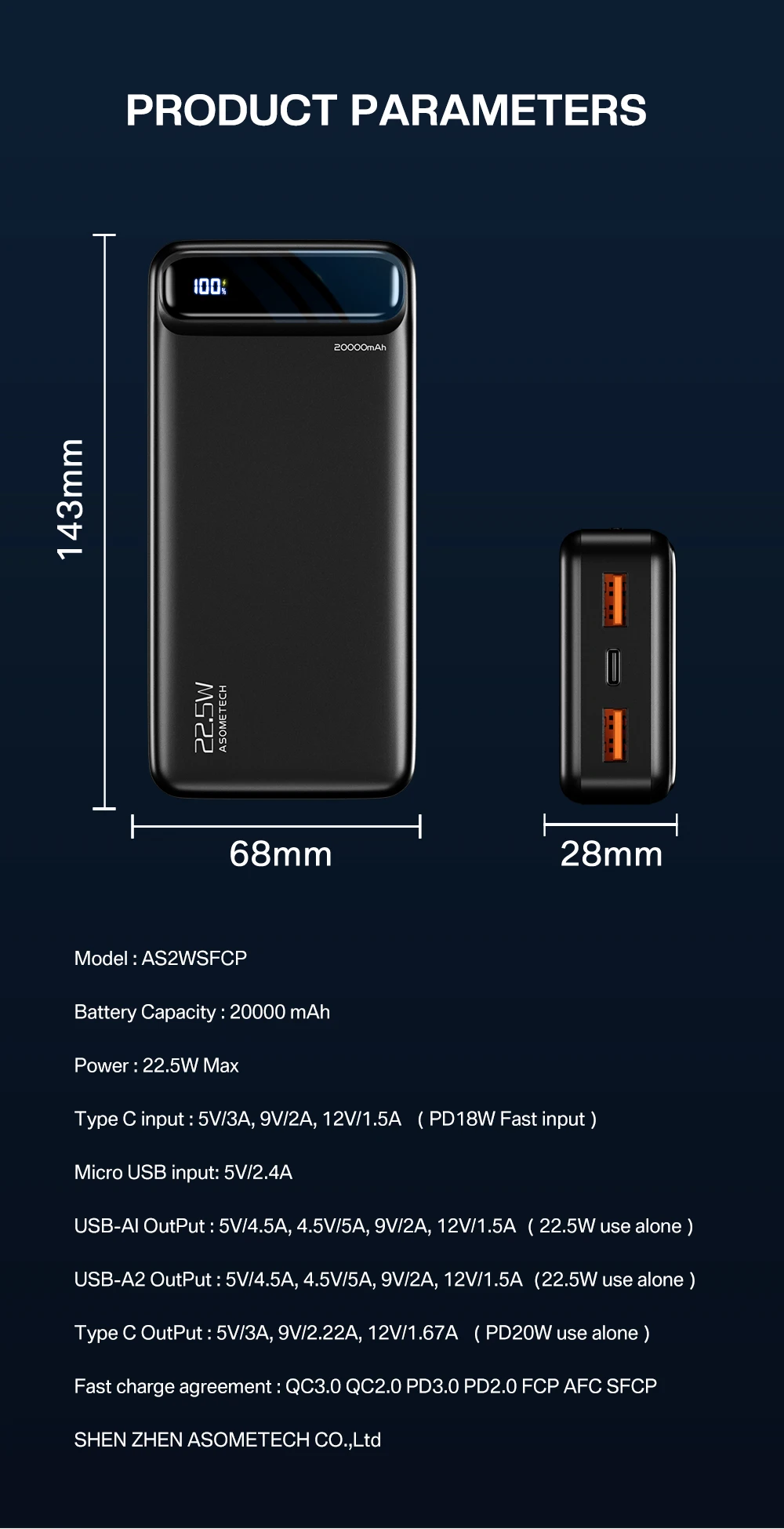Modelo: AS2WCapacidad de la batería: 20000 mAh/3,7 V (47 WH)Potencia: 22,5 W máx.Entrada tipo C: 5 V/3 A, 9 V/2 A, 12 V/1,5 A (entrada rápida PD18 W)Entrada micro USB: 5 V/3 A, 9 V/2 A, 12 V/1,5 A (QC3.0)Salida USB-A 1/2: 5 V/4,5 A, 4,5 V/5 A, 9 V/2 A, 12 V/1,5 A (22.5 W)Salida tipo C: 5 V/3 A, 9 V/2,22 A, 12 V/1,67 A (PD20 W)USB-A1+USB-A2: 5V3A máx.USB-A1+USB-A2+USB-C: 5V3A máx.Acuerdo de carga rápida: QC3.0, QC2.0, PD3.0, PD2.0, FCP, AFC, SFCPBanco de energía de 22,5 W 30000 mAh