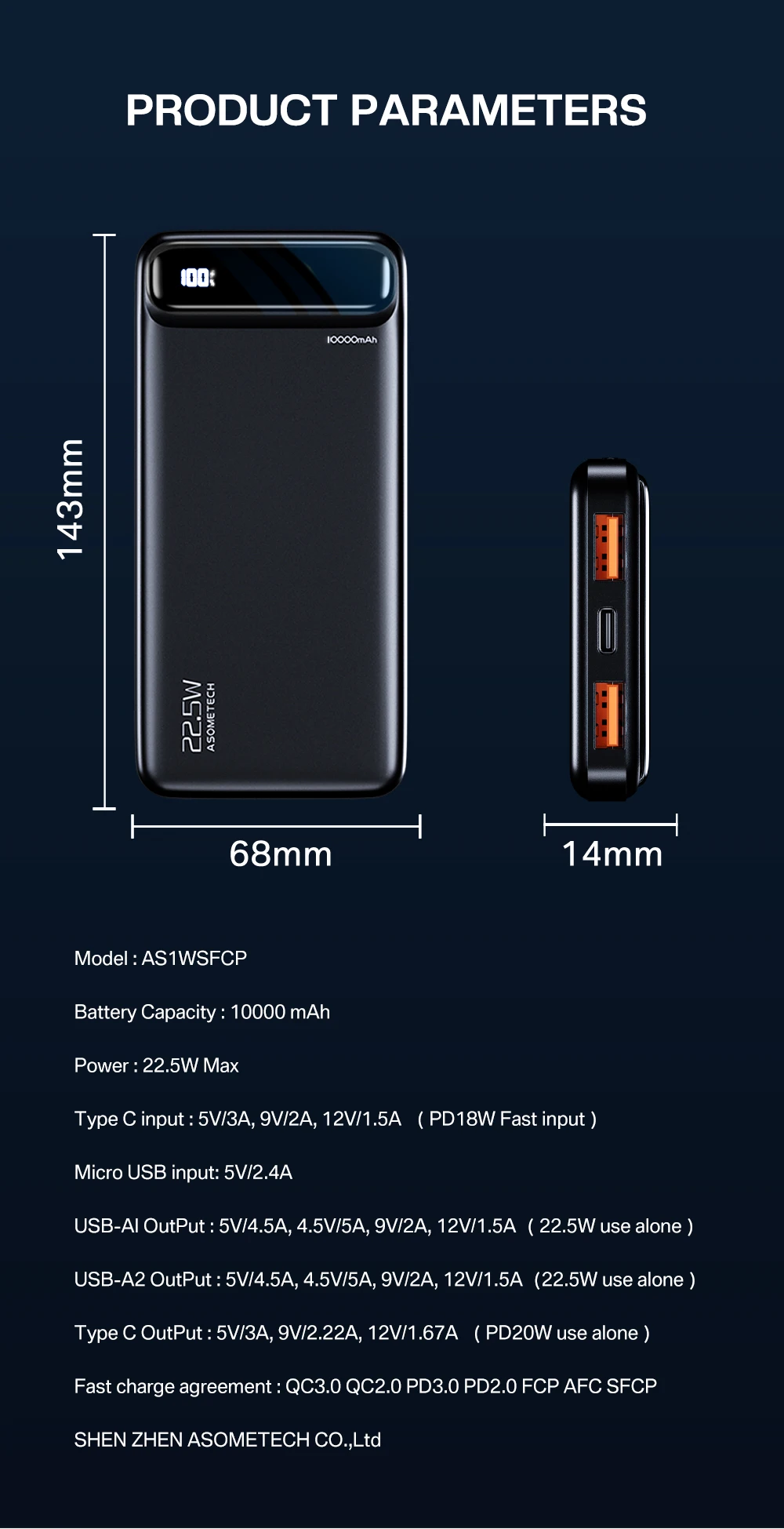 Modelo: AS1WCapacidad de la batería: 10000 mAh/3,7 V (37 WH)Potencia: 22,5 W máx.Entrada tipo C: 5 V/3 A, 9 V/2 A, 12 V/1,5 A (entrada rápida PD18 W)Entrada micro USB: 5 V/3 A, 9 V/2 A, 12 V/1,5 A (QC3.0)Entrada USB-A 1/2: 5 V/4,5 A, 4,5 V/5 A, 9 V/2 A, 12 V/1,5 A (22.5 W)Salida tipo C: 5 V/3 A, 9 V/2,22 A, 12 V/1,67 A (PD20 W)USB-A1+USB-A2: 5V3A máx.USB-A1+USB-A2+USB-C: 5V3A máx.Acuerdo de carga rápida: QC3.0, QC2.0, PD3.0, PD2.0, FCP, AFC, SFCPBanco de energía de 22,5 W 20000 mAh